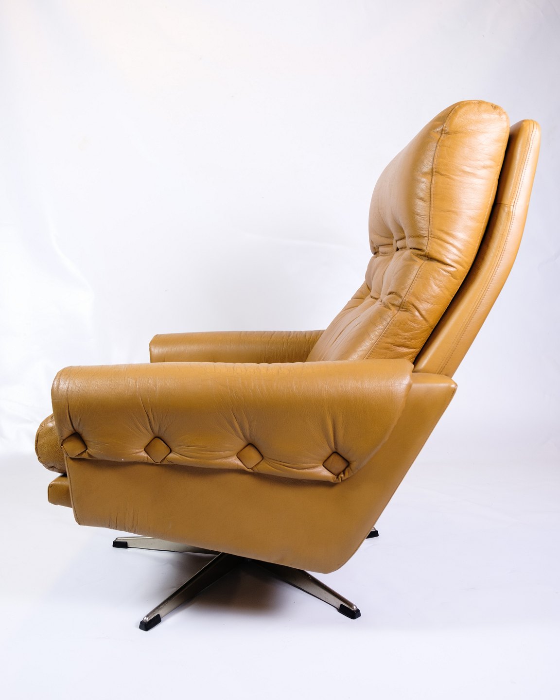 The armchair in brown leather, an example of Danish design from the 1980s, radiates both comfort and style. The deep, warm color of brown leather gives the chair a sophisticated look, while the soft leather adds a luxurious feel to any decor.