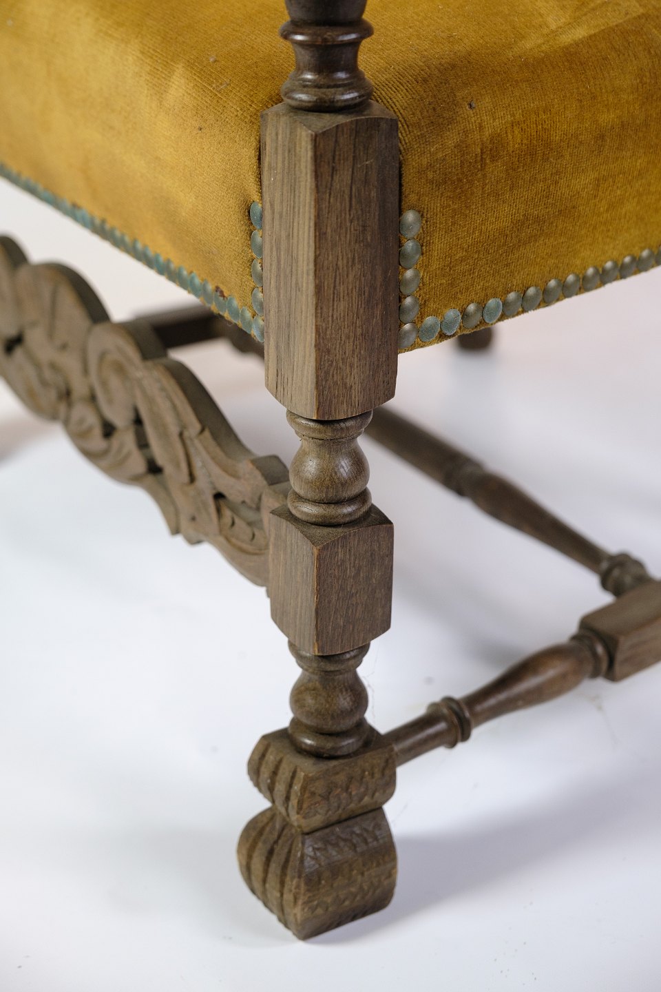 Antique King's chair - Yellow Nail-Studded Velour - Carvings in armrests & legs - Year 1920
