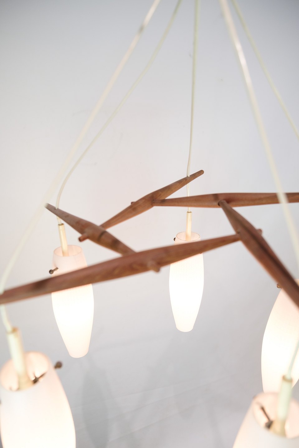 Teaktræets varme farve og opalglasets bløde belysning skaber en behagelig atmosfære i ethvert rum. Denne kombination af materialer giver lampen et organisk udseende, der passer perfekt til både moderne og retroindretninger.