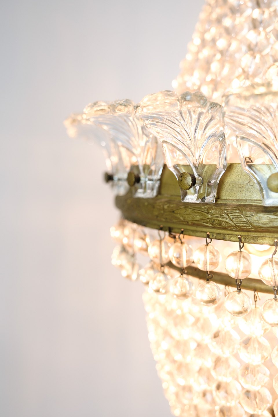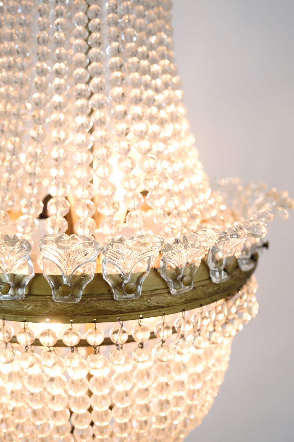 SoldAntique prism chandelier from the year 1890, made of brass and bronze, gilded and decorated with crystals. This chandelier is an example of the fine craftsmanship of the period, where precious metals and crystals create a luxurious and timeless atmosphere.