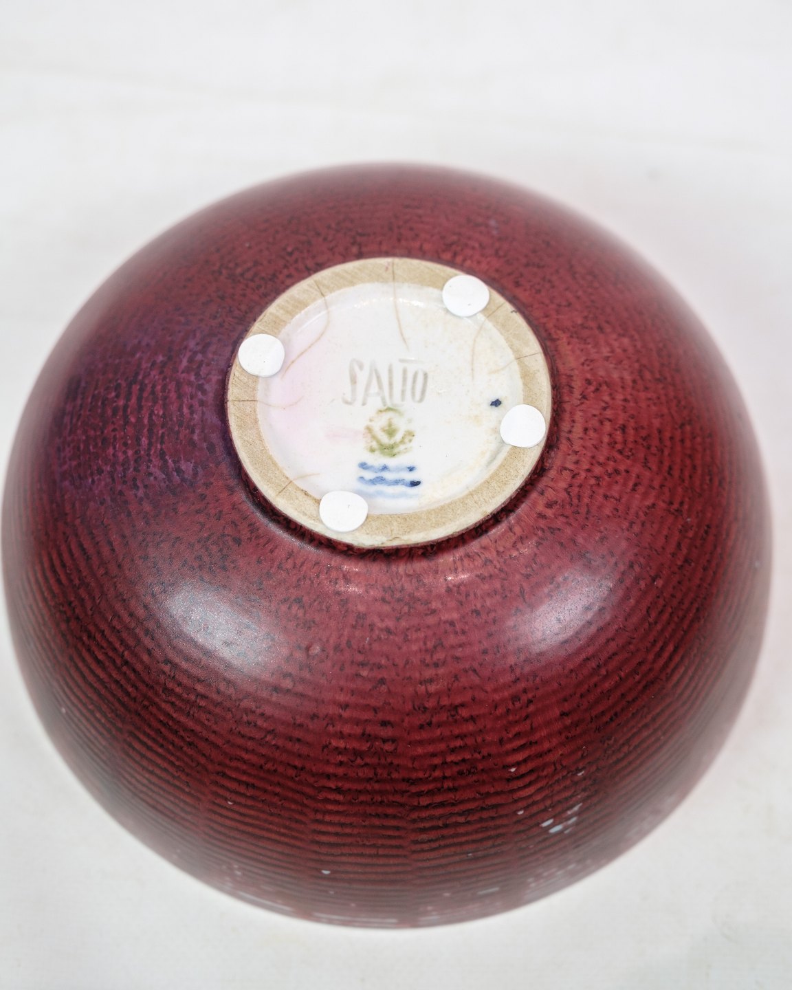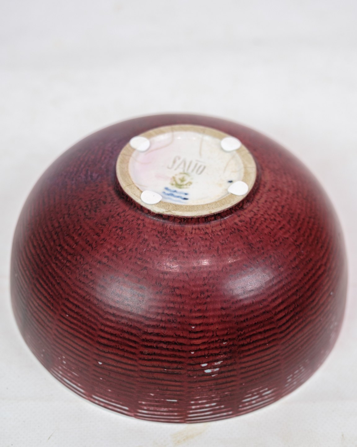 Keramikskål, model 20.717, med okseblodsfarvet glasur, designet af Axel Salto for Royal Copenhagen. Skålen er et klassisk eksempel på Salto's eksperimenterende tilgang til keramik, hvor han brugte mange forskellige glasurer for at skabe dybe og rige farvetoner.