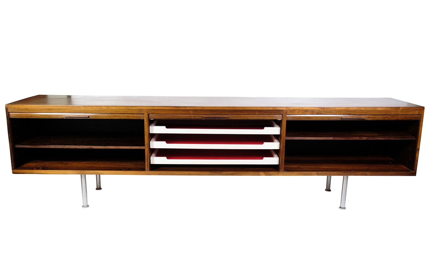 Denne skænk i palisander repræsenterer den tidløse elegance og funktionalitet, der kendetegner dansk design fra 1960'erne. Skænken tilbyder både stil og praktisk opbevaringsplads.