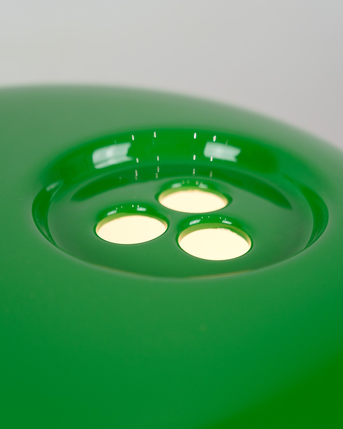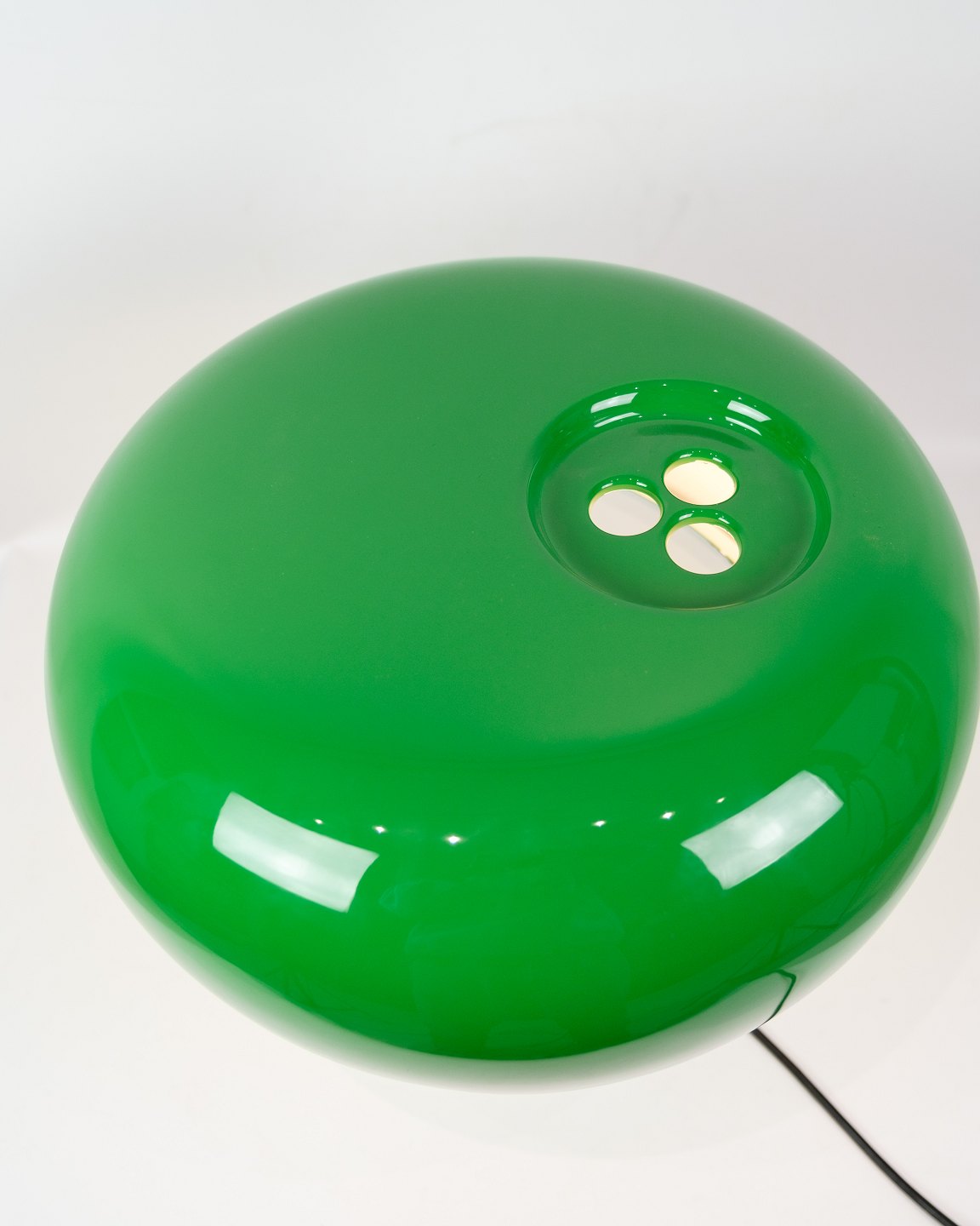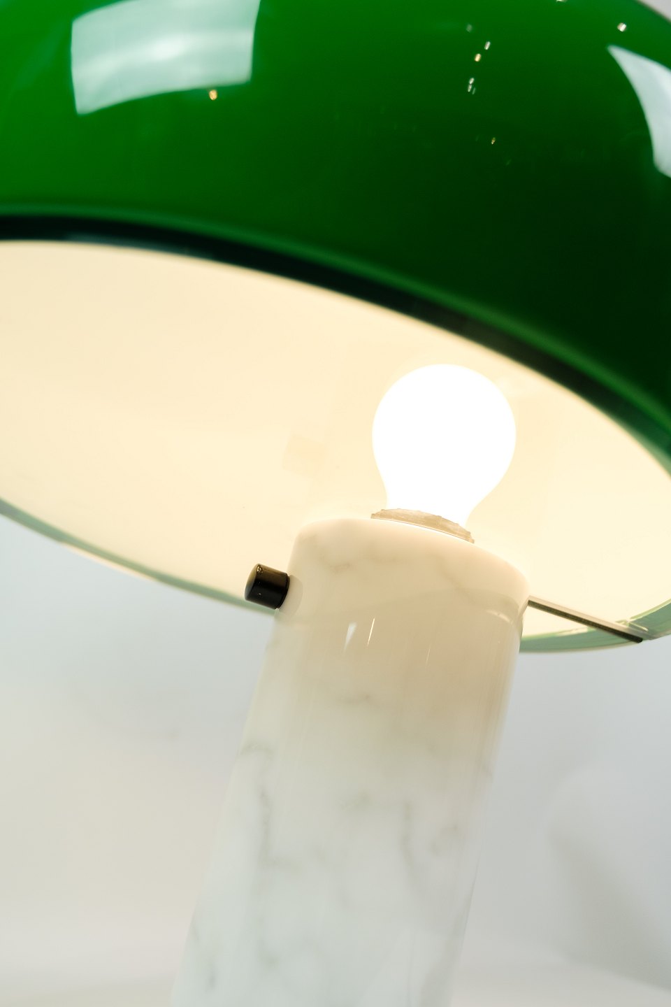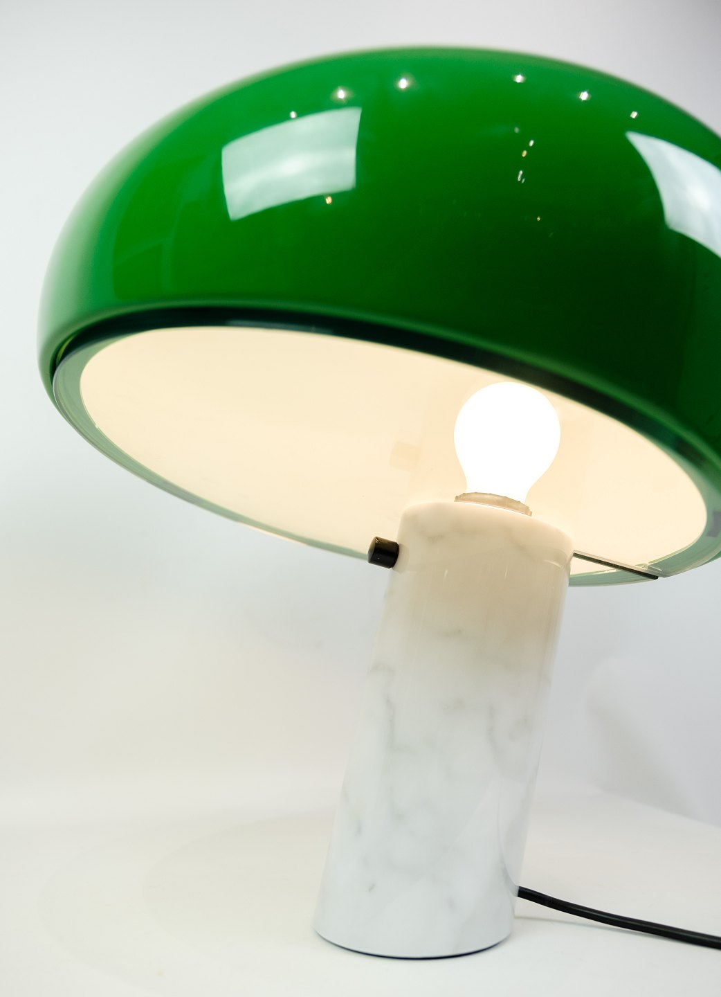 SoldTable lamp with green enamelled metal reflector and white Carrara marble base. The lamp was designed by Achille and Pier Giacomo Castiglioni in 1967. The lamp is made by Flos and the light from the lamp creates a cozy atmosphere.