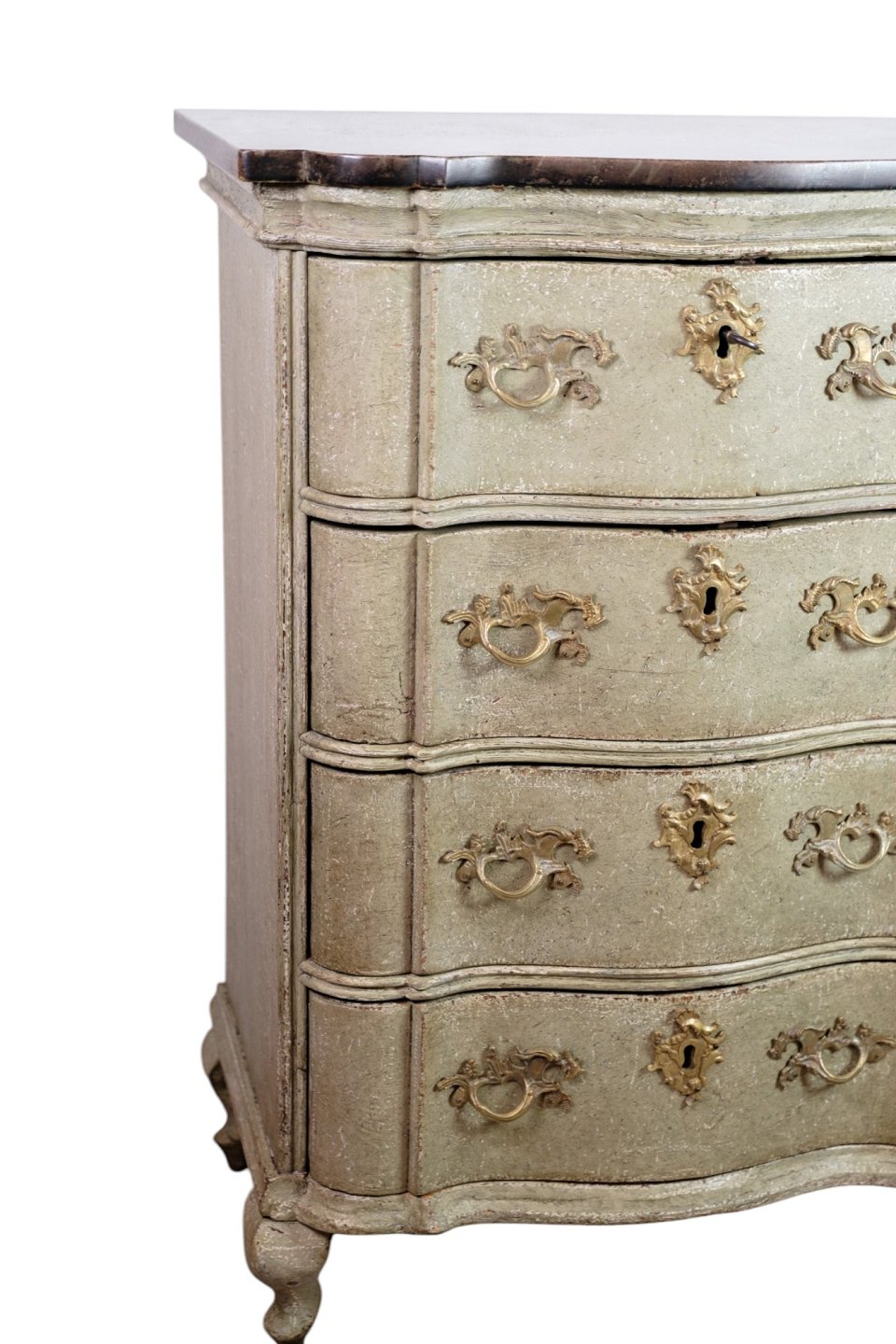 En antik kommode fra 1740'erne udført i barok stil. Kommoden har sin originale grålige maling, der fremhæver dens historiske charme, og er udstyret med en mørkebrunlig marmor plade. Dens karakteristiske buede former og detaljerede udskæringer er typiske for barokkens overdådige designæstetik. Denne kommode repræsenterer et autentisk stykke håndværk fra 1700-tallet og er velegnet som et unikt møbel til klassiske eller moderne interiører.
