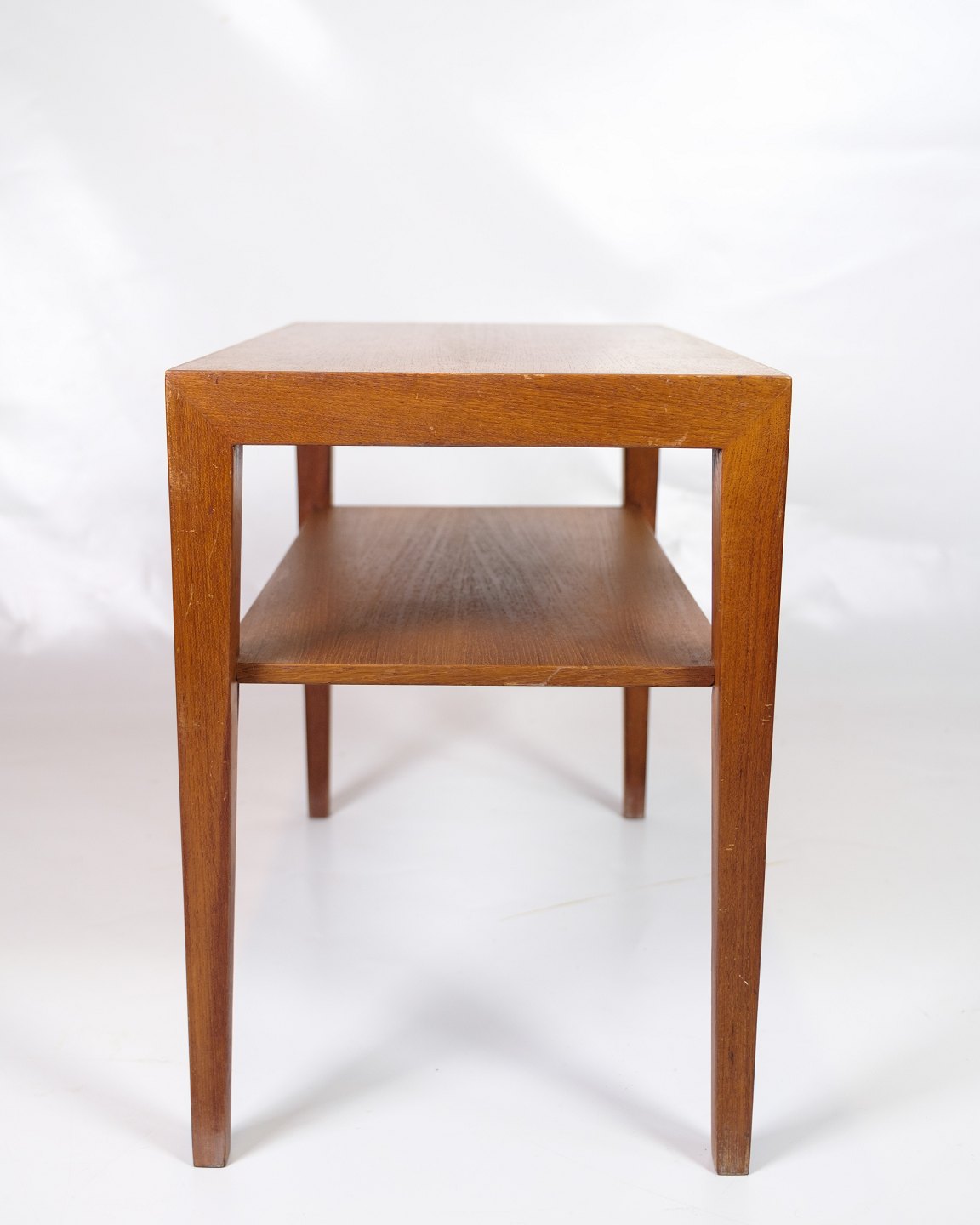 SoldSet of 2 teak side tables with shelf, designed by Severin Hansen and produced by Haslev Møbelfabrik in the 1960s. The tables have the characteristic and precise joinery that Hansen is known for, including the beautiful, slanted leg joints that elegantly meet the table top. The extra shelf provides practical storage space and makes the tables usable both as side tables and small coffee tables.