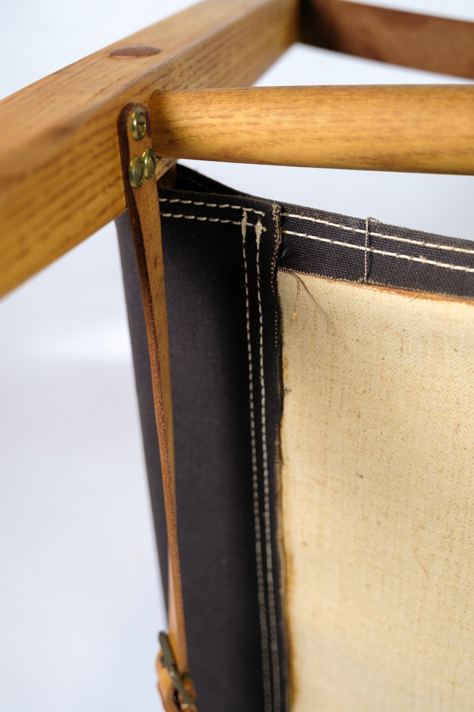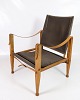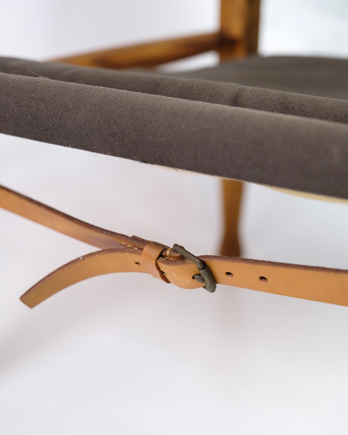 SolgtEt sæt safari-lænestole designet af Kaare Klint og fremstillet af Rud. Rasmussen. Stolene er udført i asketræ med sæde og ryg i brunt kanvas samt armlæn i kernelæder. Safari-stolene er kendt for deres enkle og funktionelle design, hvor fleksible materialer og aftagelige elementer gør dem både lette og praktiske.