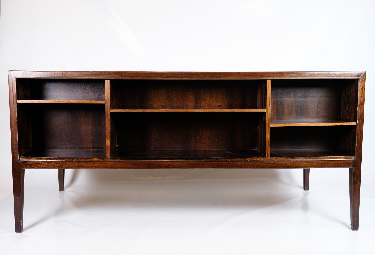 Fritstående skrivebord designet af Jacob Kjær i 1960'erne. Skrivebordet er udført i eksklusiv palisander og har otte rummelige skuffer med elegante messinggreb. Det fritstående design gør det velegnet til placering midt i rummet, da bagsiden er lige så gennemført og smuk som fronten.