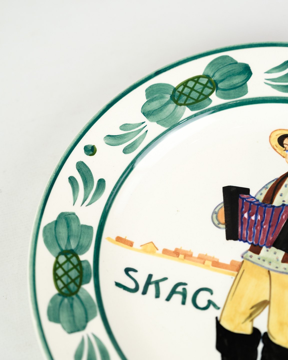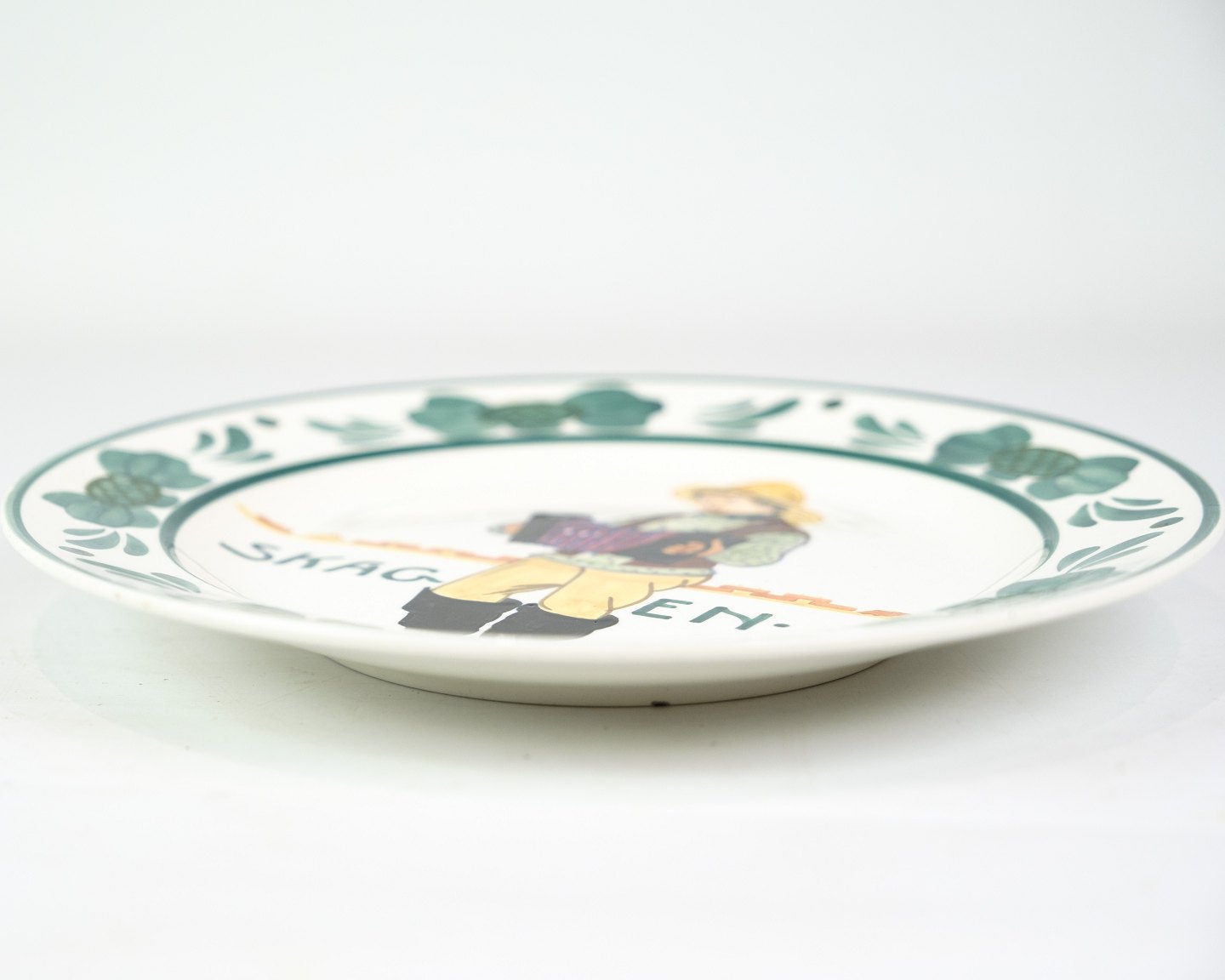 This Skagen plate, model 352/229, is made of earthenware by Aluminia and decorated with a beautiful motif of a man in traditional costume. The design reflects Skagen's rich cultural heritage and craft traditions, making the plate a charming and historically interesting object.