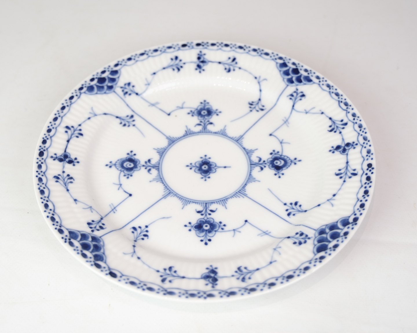 Middagstallerken mærket 1/577 fra Royal Copenhagen. Fremstillet i porcelæn med klassisk musselmalet halvblonde design. Håndmalet i blå dekoration.