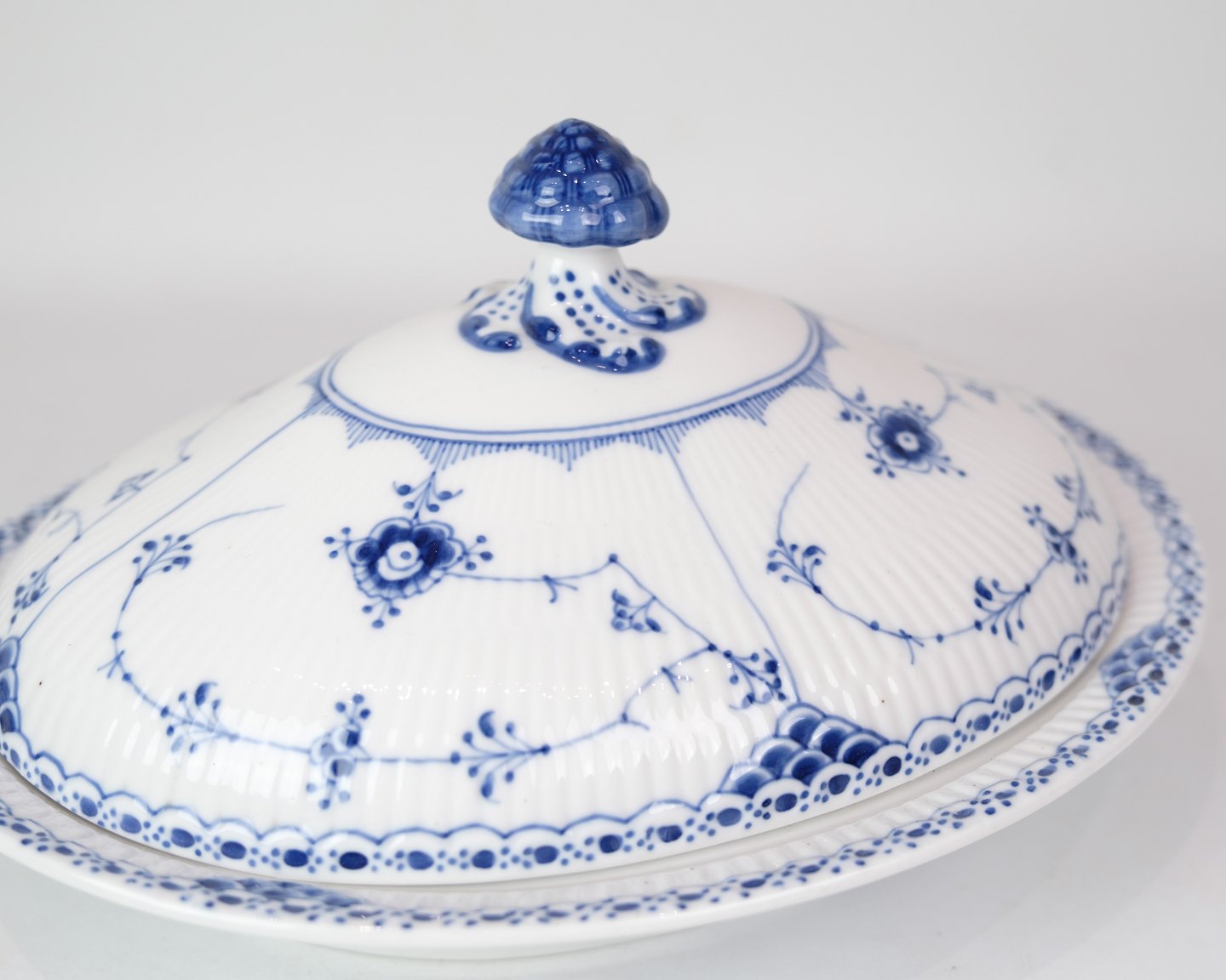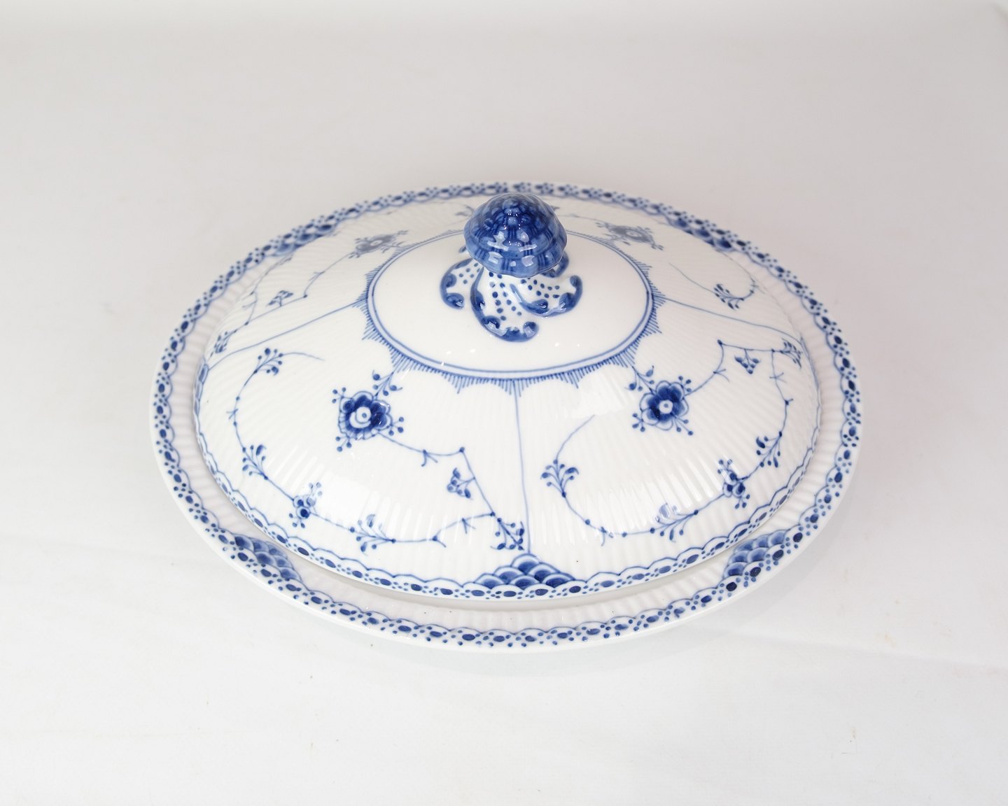 Royal Blue Fluted Half Lace Lidded Dish marked 1/621 from Royal Copenhagen. Made of porcelain, hand-painted blue decoration.