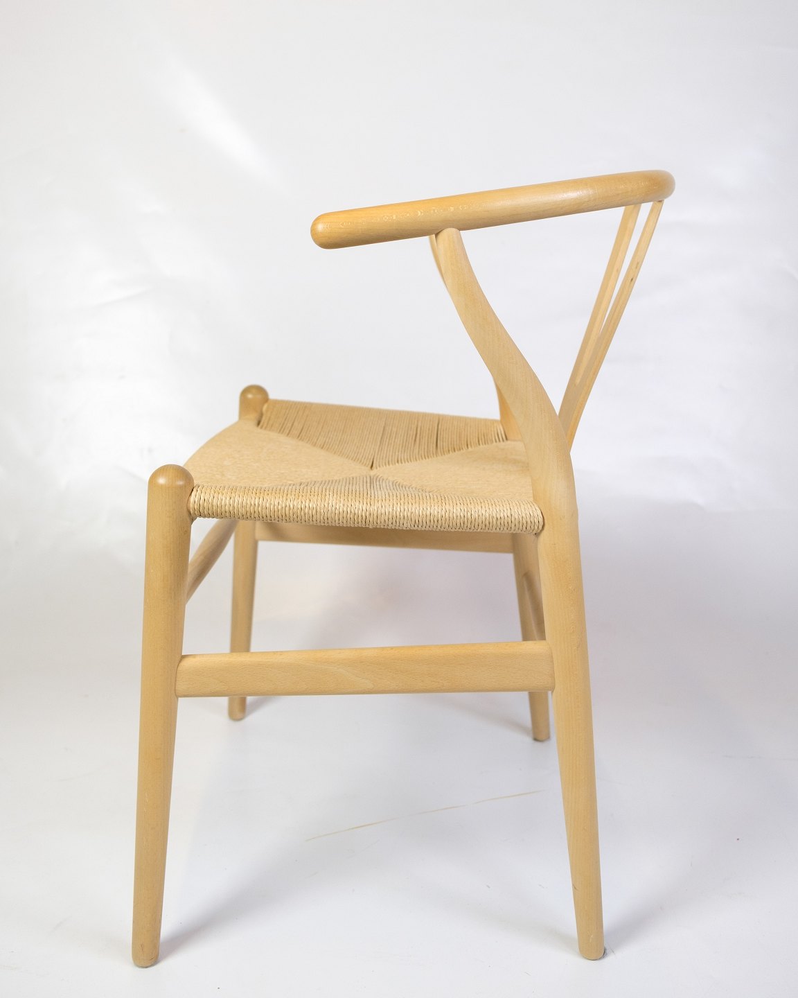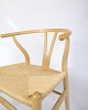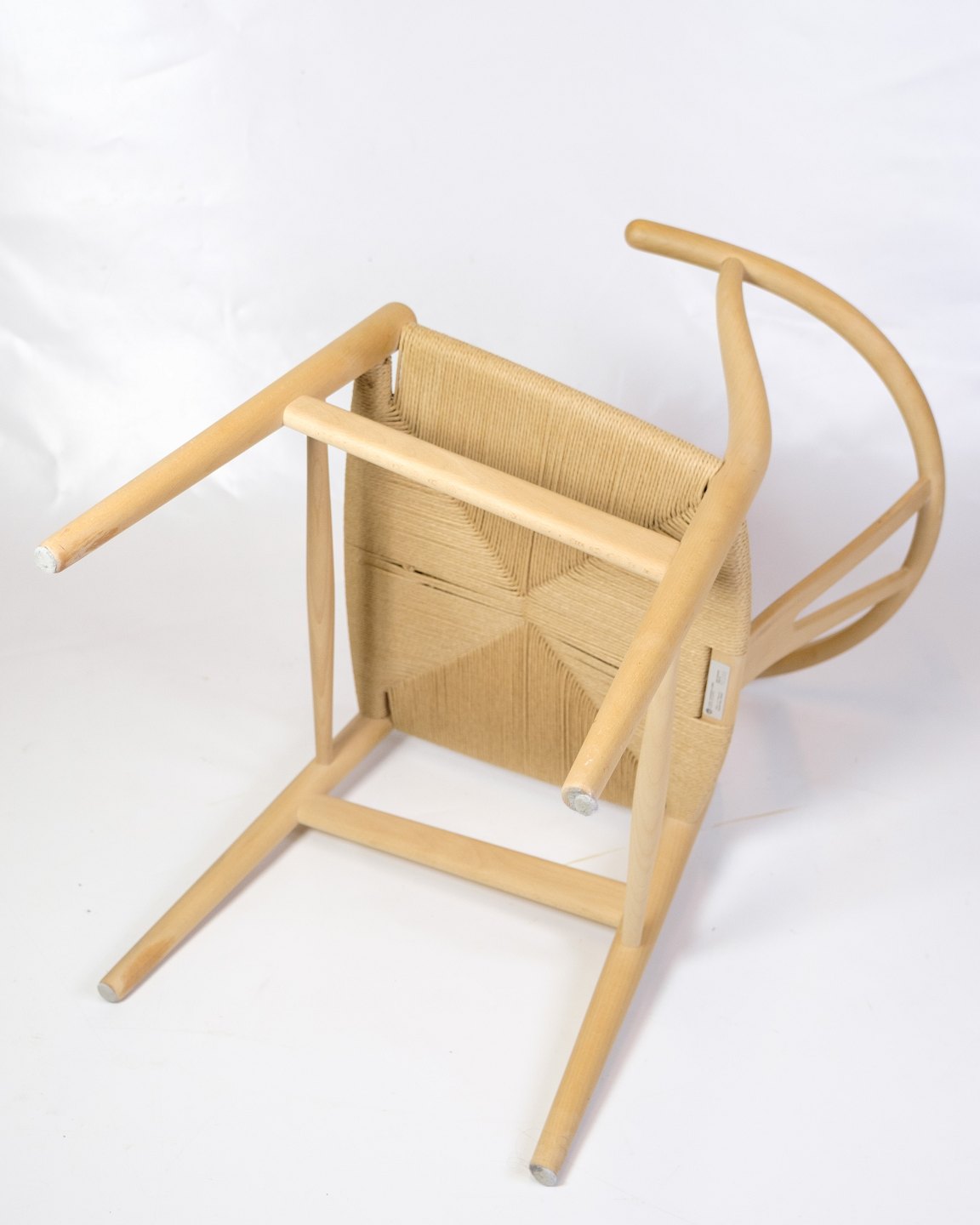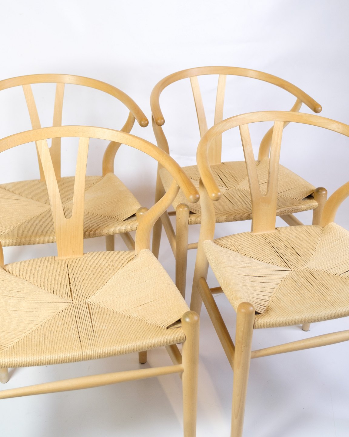 SoldSet of four wishbone chairs, model CH24, designed by Hans J. Wegner and produced by Carl Hansen & Son. Made of beech with hand-woven paper yarn seat. Hans J. Wegner (1914–2007) was a Danish furniture designer who created over 500 chairs with a focus on function, craftsmanship and simple design. The wishbone chair is one of his best-known works and a firm icon in Danish furniture tradition.