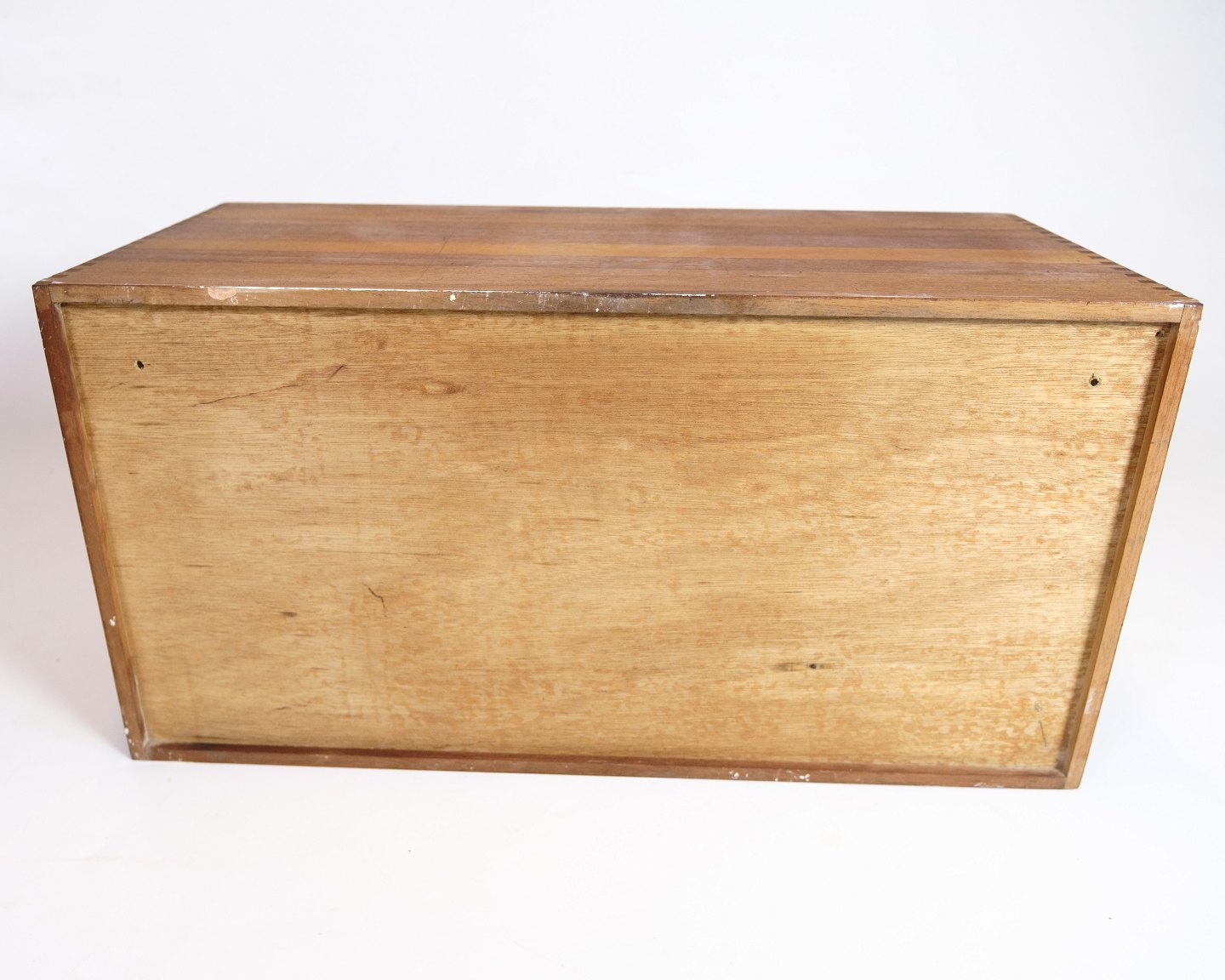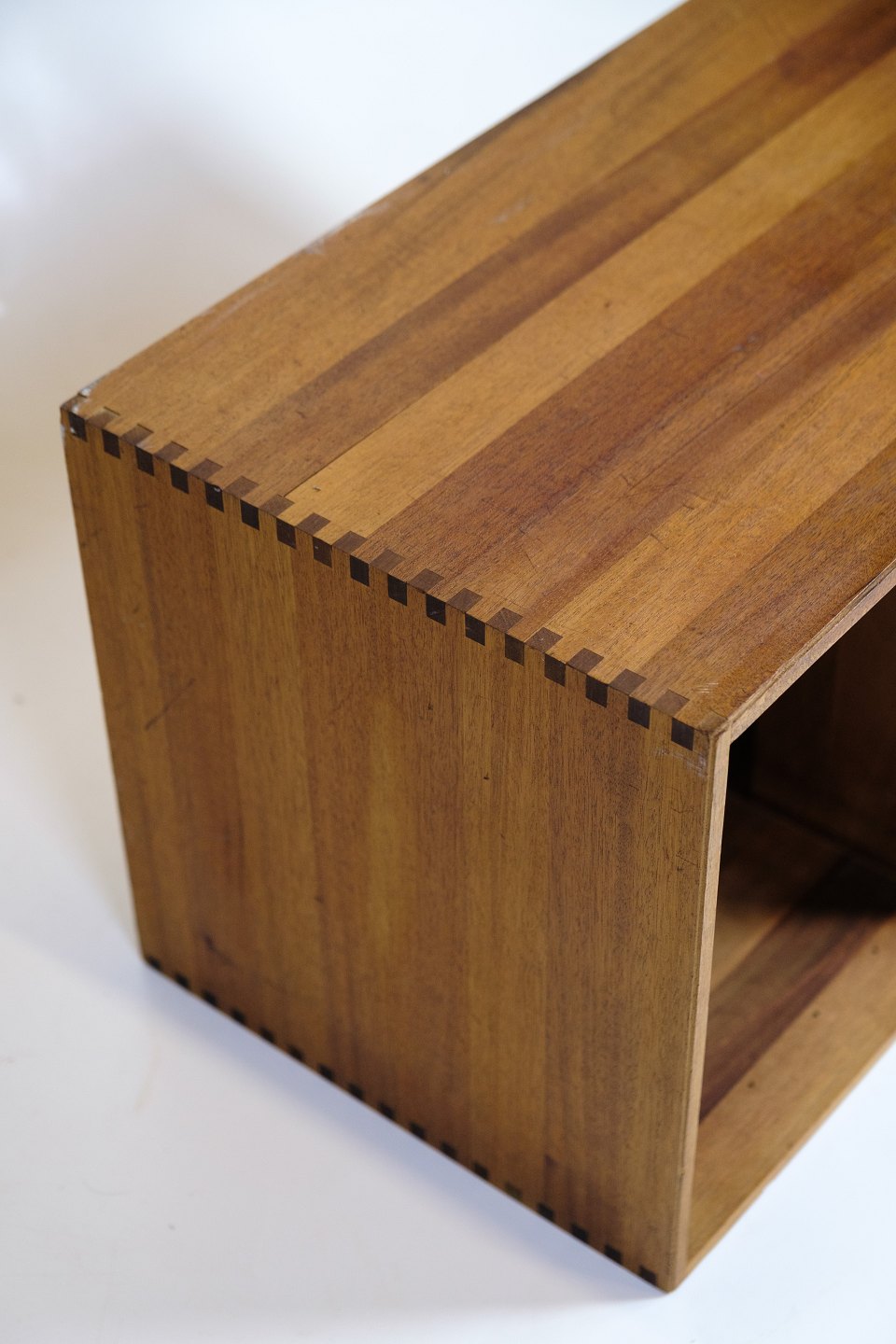 SolgtBogreol i teak med tappede samlinger, dansk design fra 1960’erne. Reolen er inddelt i to rum og egner sig godt som både vægmonteret enhed eller stående modul i en reolsammensætning.