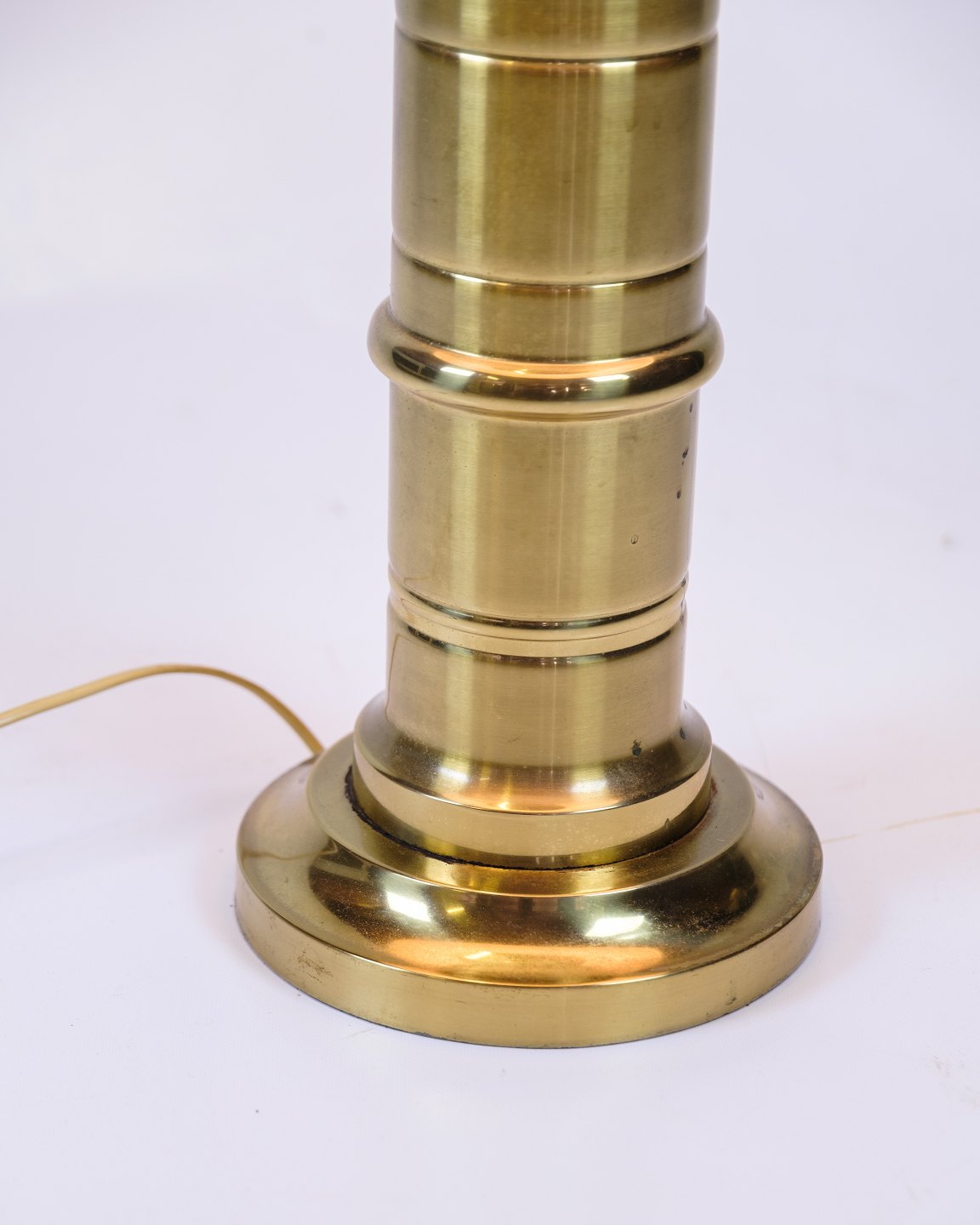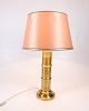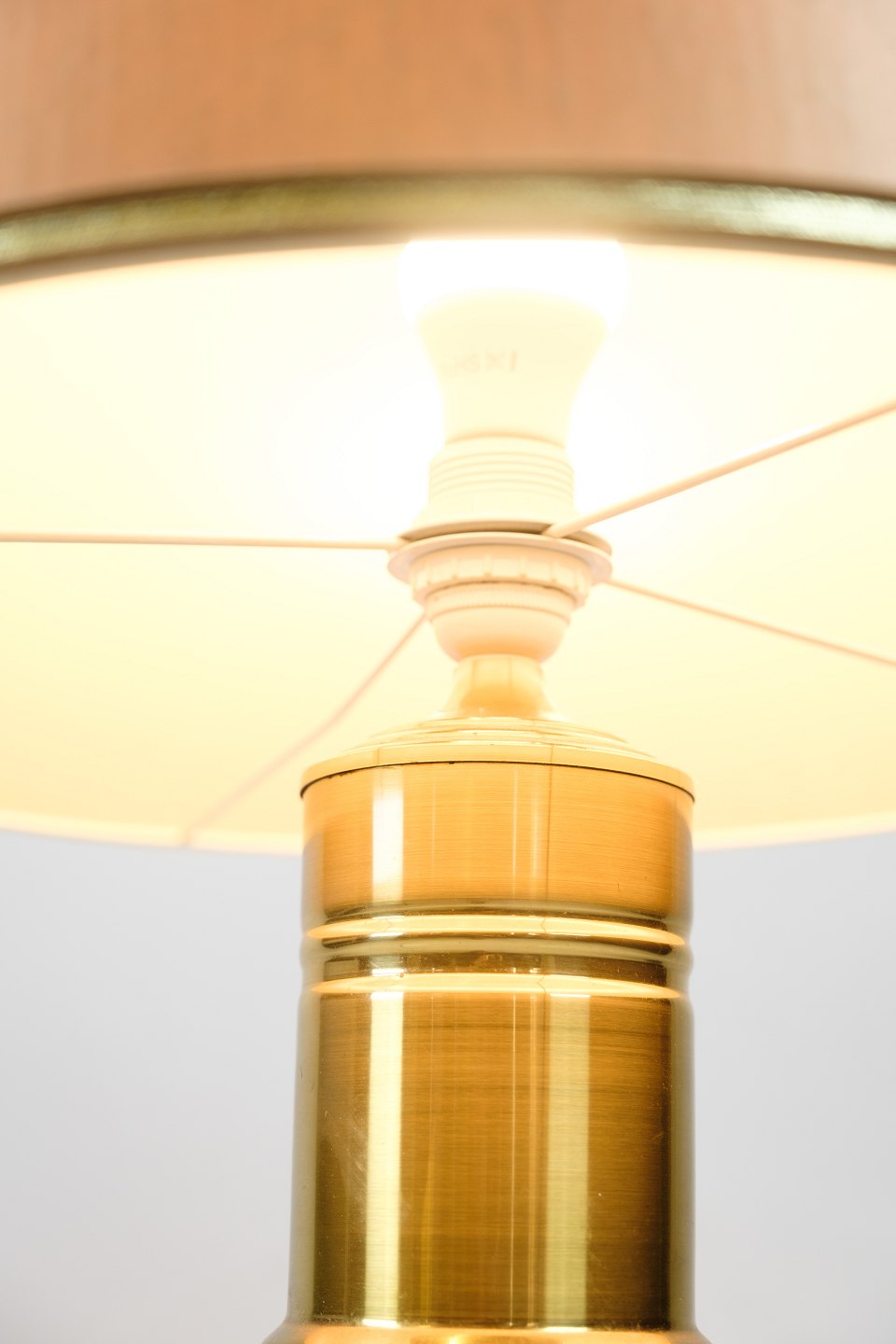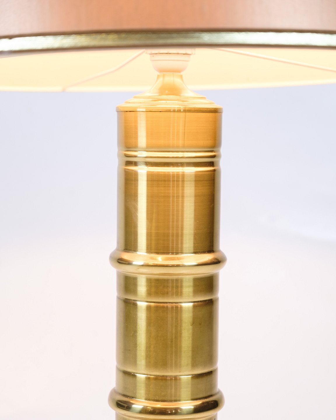 SolgtSæt af 2 vintage bordlamper fra 1970’erne med messingfødder og lyserøde lampeskærme. Klassisk retrodesign.