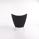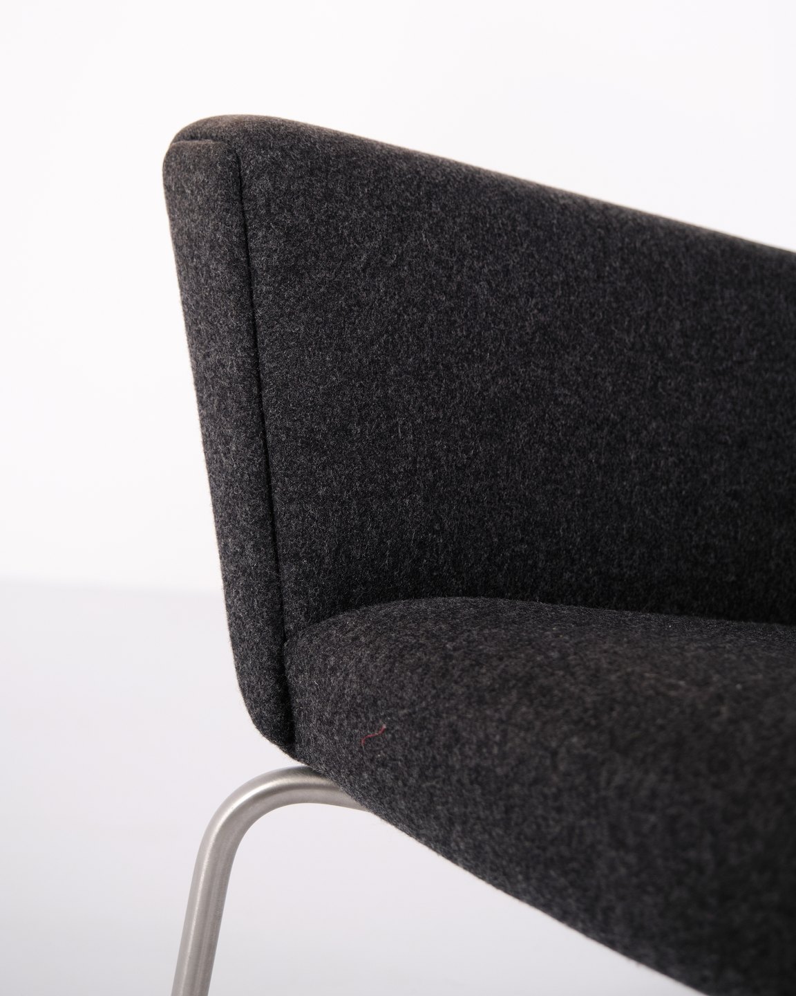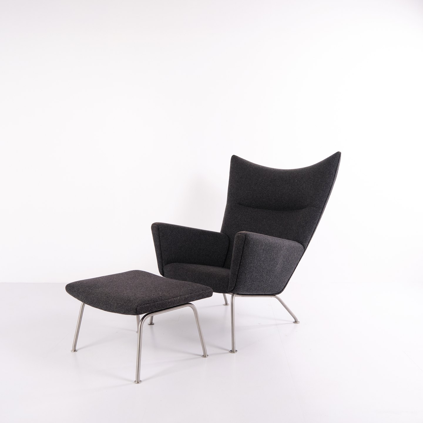 CH445 Wingchair designed by Hans J. Wegner and produced by Carl Hansen & Søn. Upholstered in grey Hallingdal fabric with matching footstool. A classic high-back Wegner model with distinctive wings and excellent seating comfort. A well-known Danish design icon.
