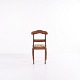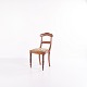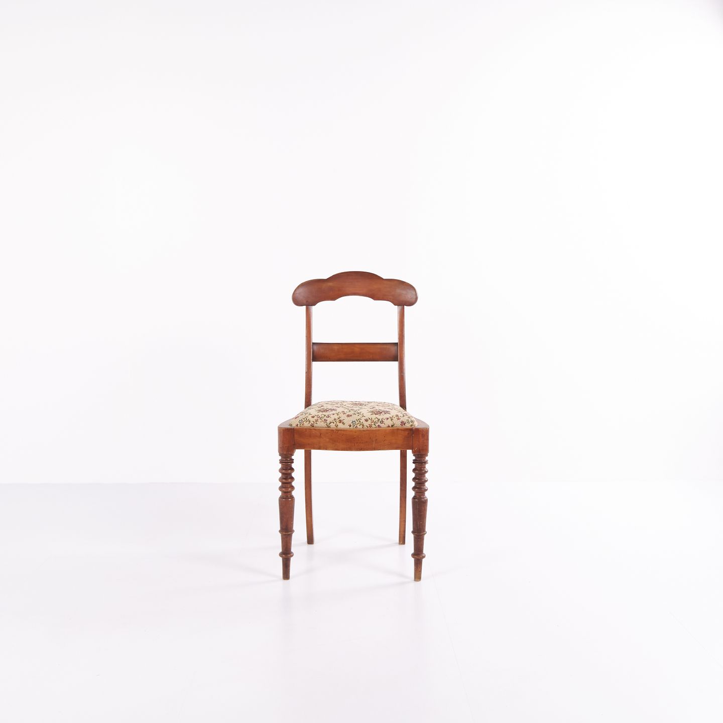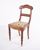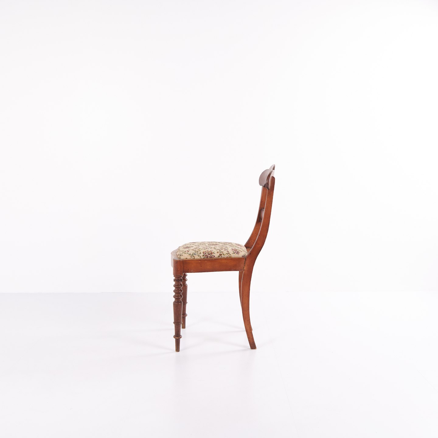 Dining or hall chair in late Empire style, crafted in mahogany and upholstered in floral fabric. Classic design with period-typical lines and a gently curved back. A decorative chair suitable for both dining spaces and hallways.