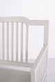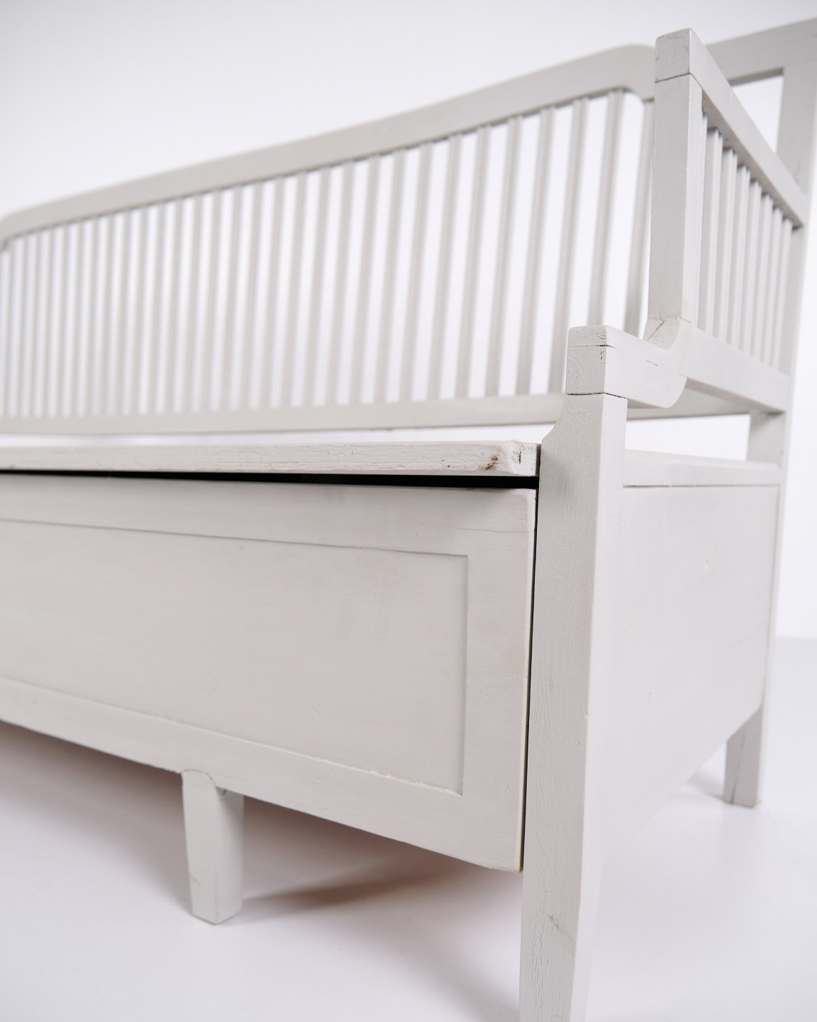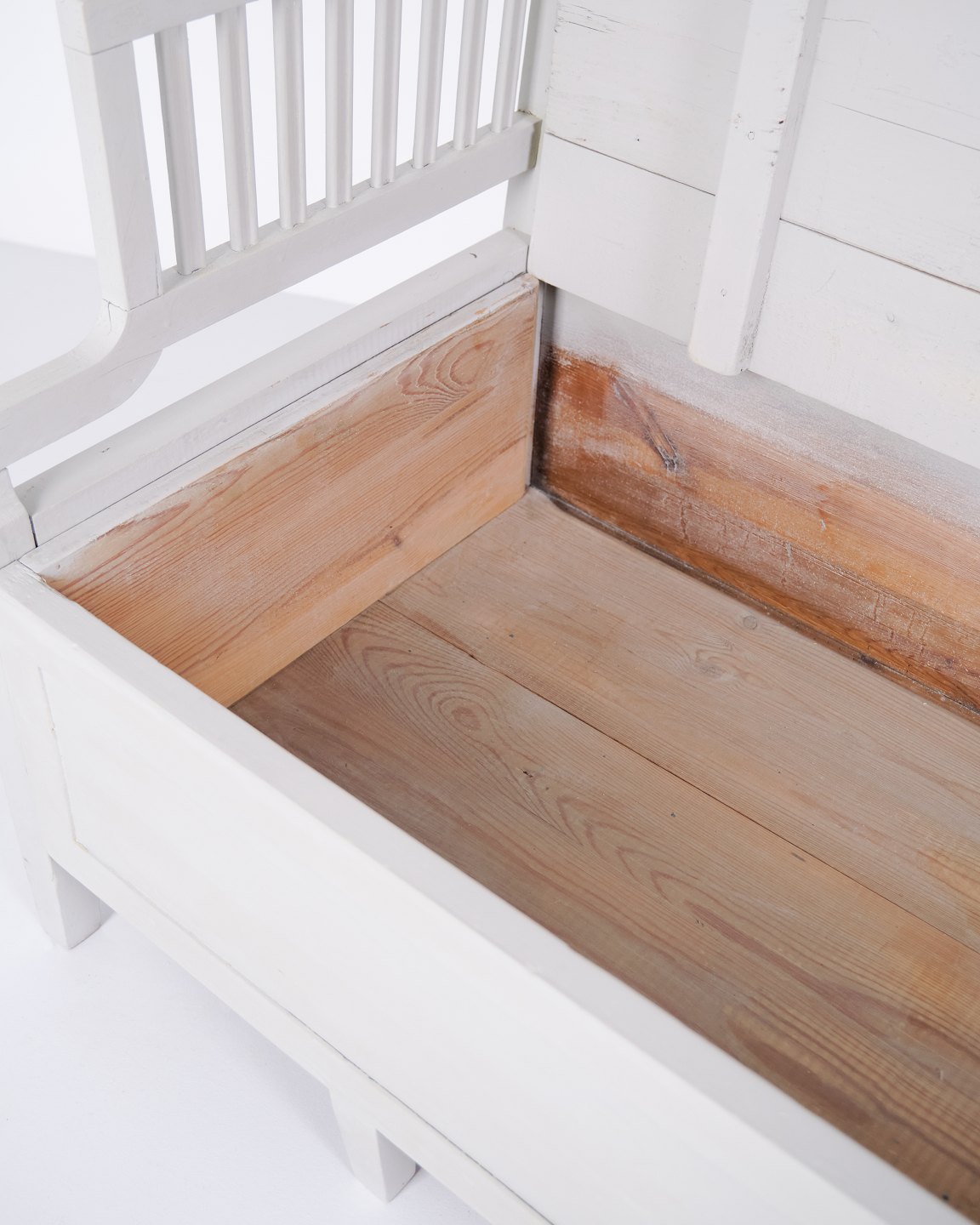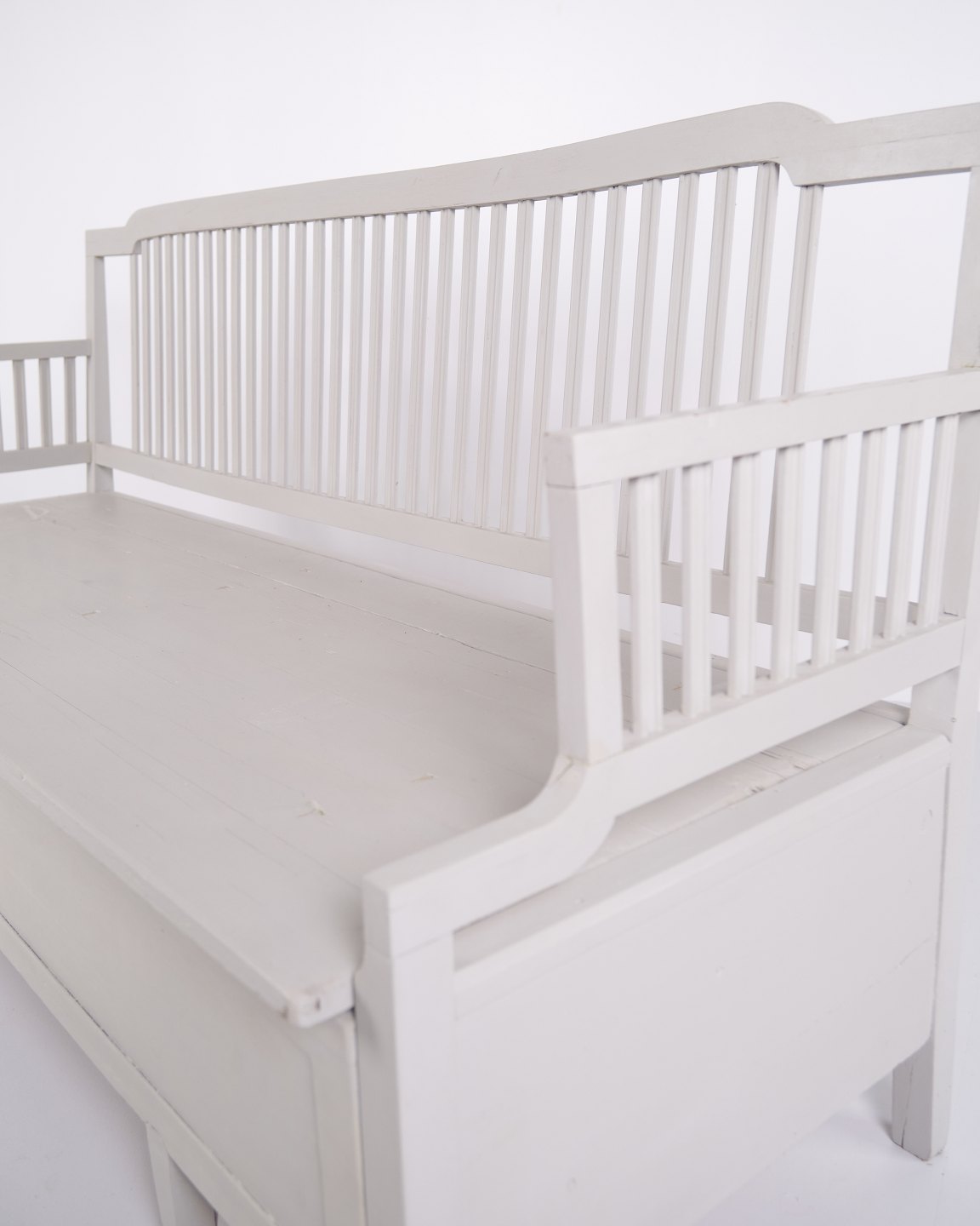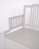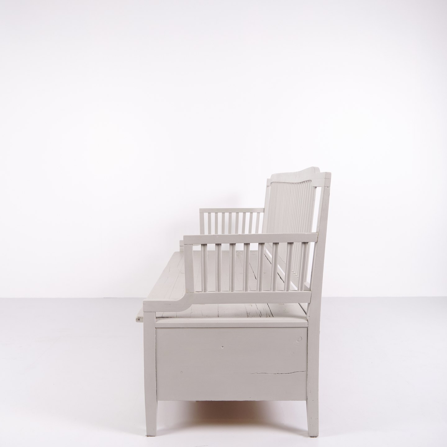 Antik slagbænk 1860’erne i gråmalet fyrretræ med høj ryg og opbevaring. Antik opbevaringsbænk 1800-tallet.