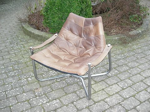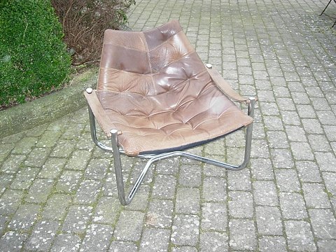SolgtEt par hvilestole i svensk design.Udført i brunt kernelæder med stål ben .5000 m2 udstilling.Prisen for parret er 4800 kr