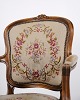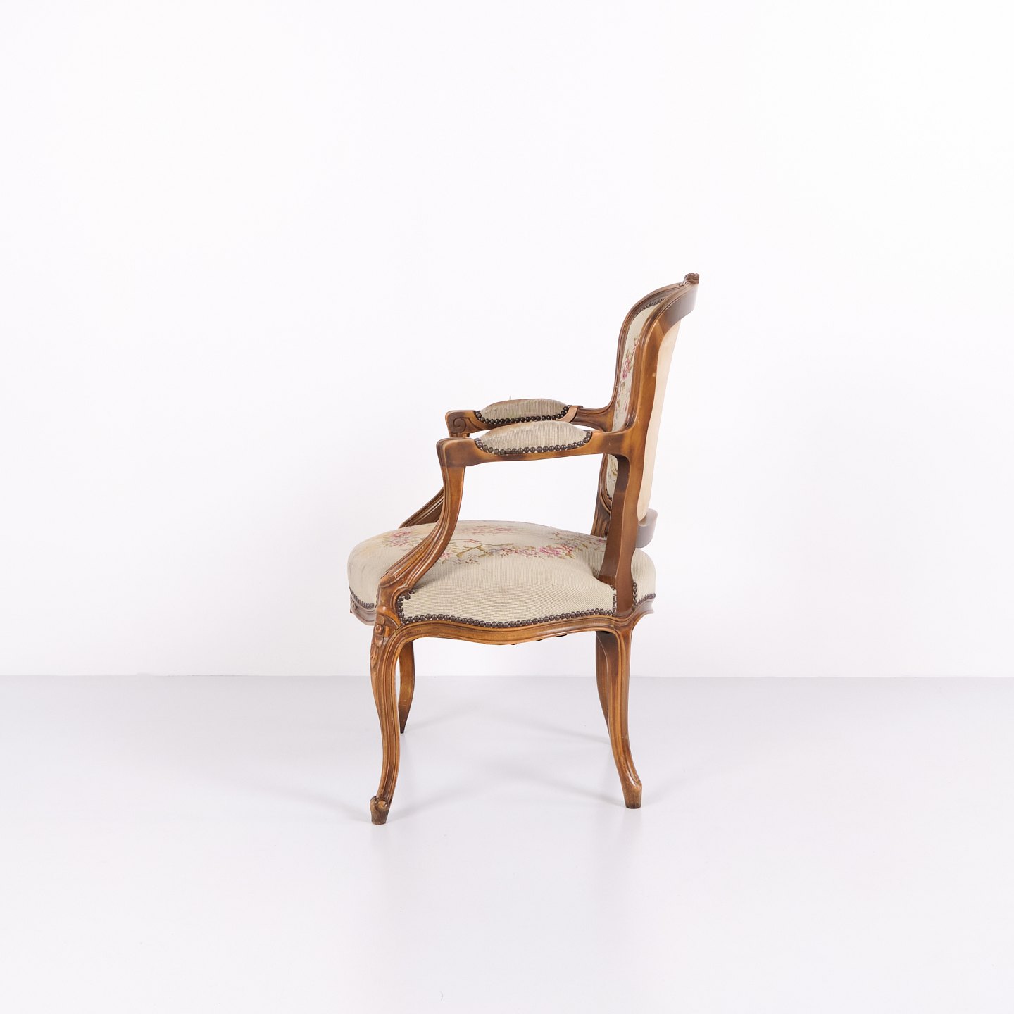 Neo-Rococo armchair from the 1930s with curved legs and floral fabric. Classic and decorative piece of furniture with a romantic expression.