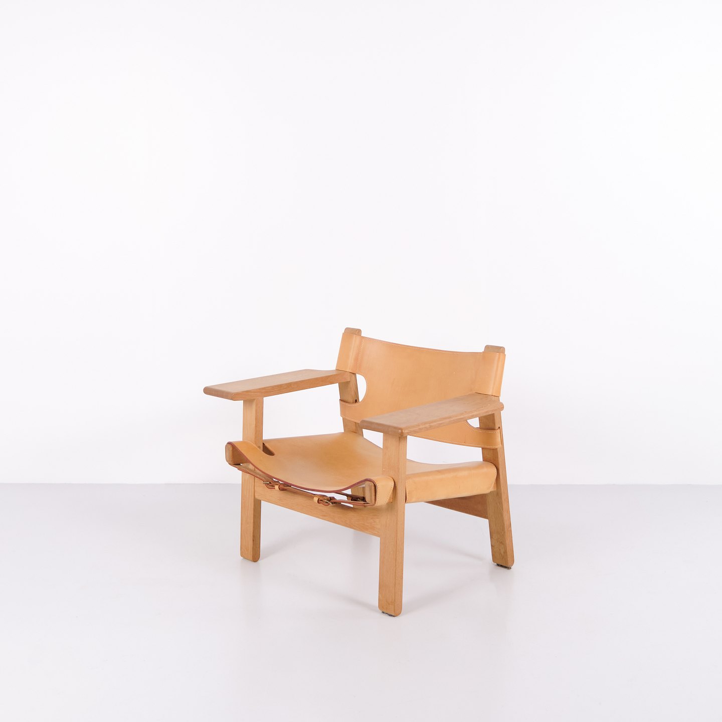 Børge Mogensen Den Spanske Stol model BM2226 i naturligt patineret kernelæder fra 1960’erne. Klassisk dansk designikon med robust udtryk.