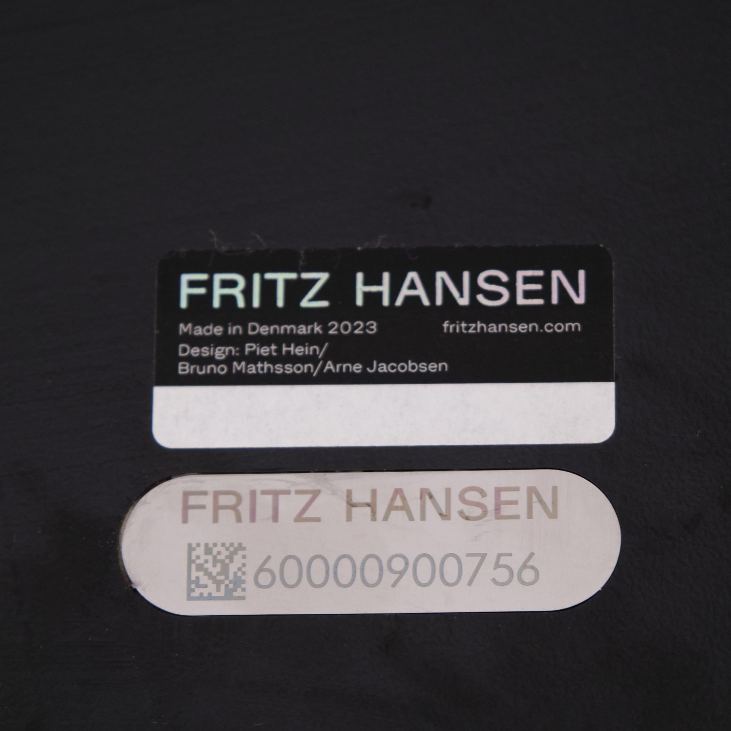 Dette eksemplar er fremstillet hos Fritz Hansen i 2023 og er udført med stel i aluminium og bordplade i sort laminat. Bordet fremstår som et nutidigt eksempel på det klassiske danske design.