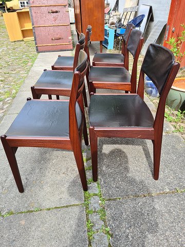 6 elegante spisebordsstole i teaktræ og sort læder. Fremstillet hos Frem Røjle møbelfabrik. Fremstår flotte og stabile med god patina.