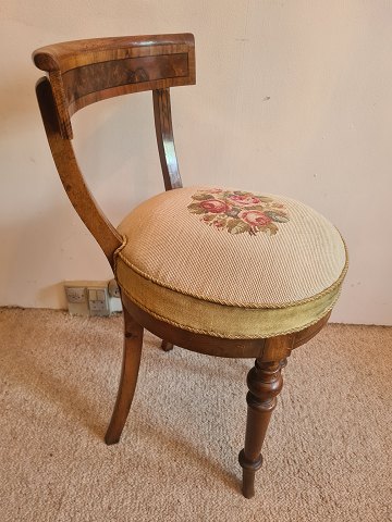 Pianostol fra 1930'erne I mahogni og fyr med broderet sæde. Fremstår pæn og velholdt uden nævneværdige brugsspor.