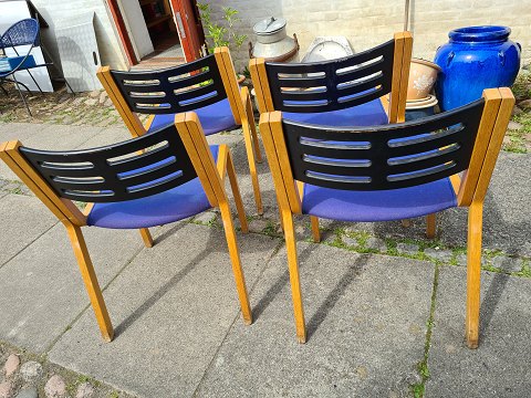 4 kontorstole i bøgetræ med sort ryg og sæde i blåt stof designet af Magnus Olesen. Fremstår gode og stabile dog med lidt brugsspor på et par af sæderne der kunne trænge til en rens.