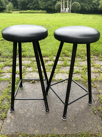 Dansk produceret par barstole m. stel af sortmalet metal samt sæde betrukket med sort læder. Produceret omkring 1980'erne. Pæn stand.