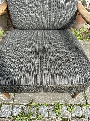 Fremstår i brugt stand, stel med ridser og mærker samt hynder med mindre huller og løs stofkeder. Bør ombetrækkes.