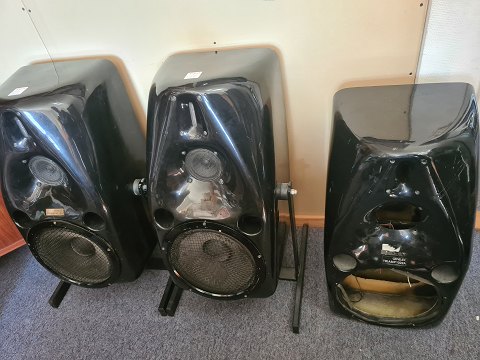 3 GENELEC TRIAMP 1022A gulvhøjtalere. Testet og virker. Fremstår med brugsspor i form af overfladeridser. Kommer med ophæng i metal. Yderligere medfølger 3 stk. der er til reservedele/restaurering. 1 hvor bassen er kaput. 1 der ikke kommer lyd ud af og 1 tomt kabinet. Diverse strøm- og tilslutningkabler medfølger ligeledes.