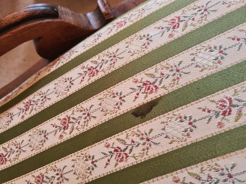 Flugtstol fra 1930'erne i mahogni. Fremstår pæn og velholdt uden de store brugsspor. Dog med en lille plet på sædet. (Billede)