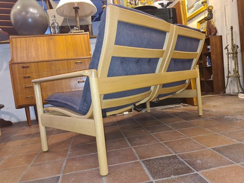 Sofagruppe udført i massiv lakeret eg m. hynder i uldstof. Produceret af Madsen & Schubell Møbelfabrik ca. 1970'erne. Fremstår i pæn brugt stand.