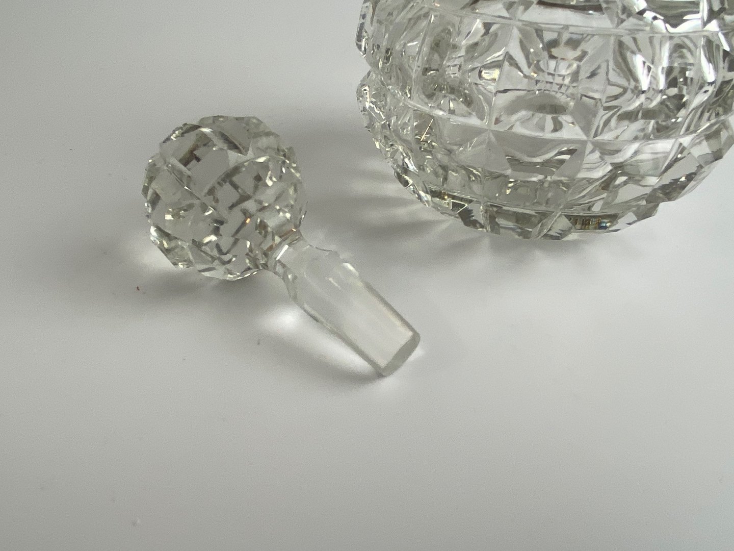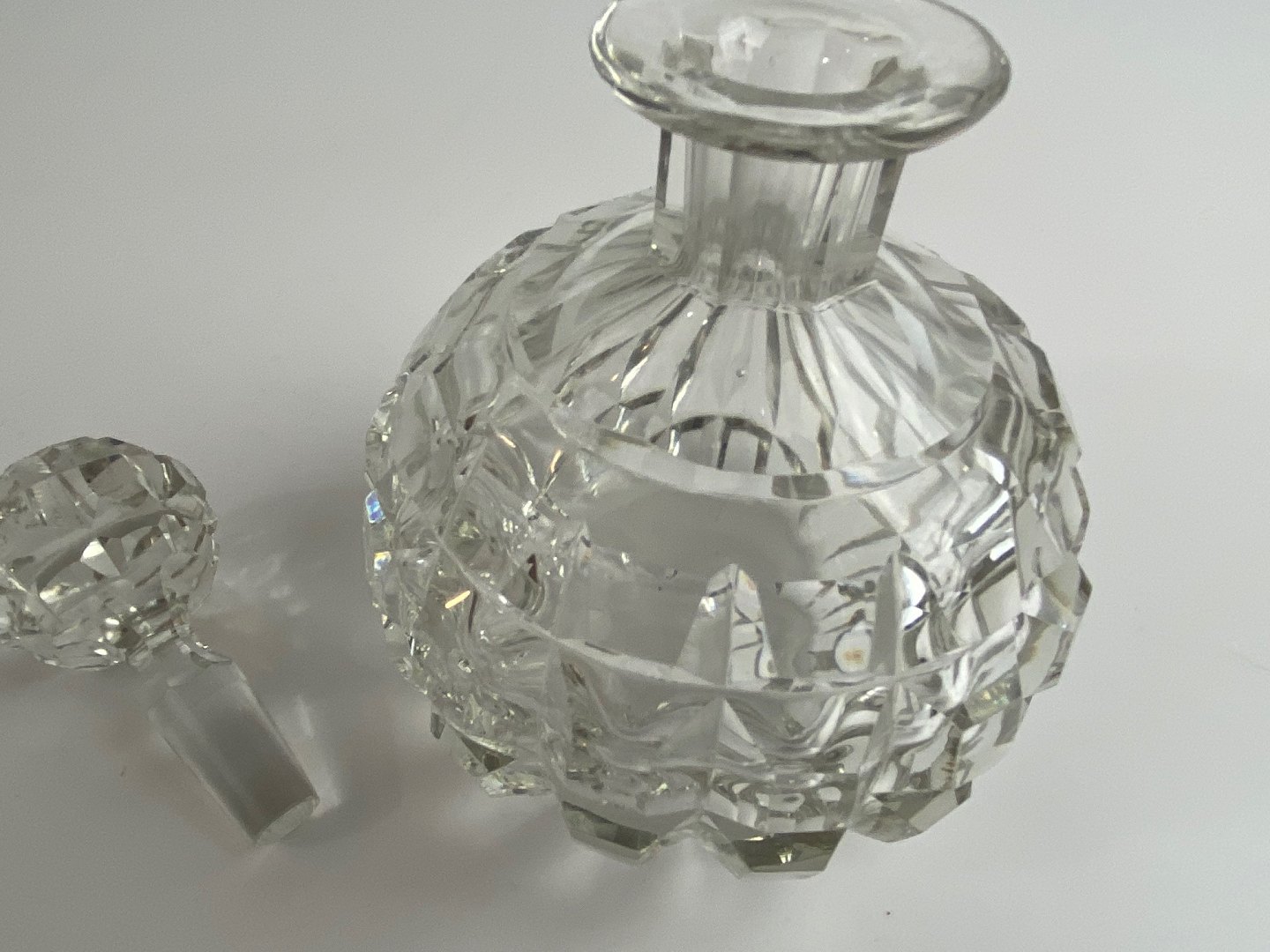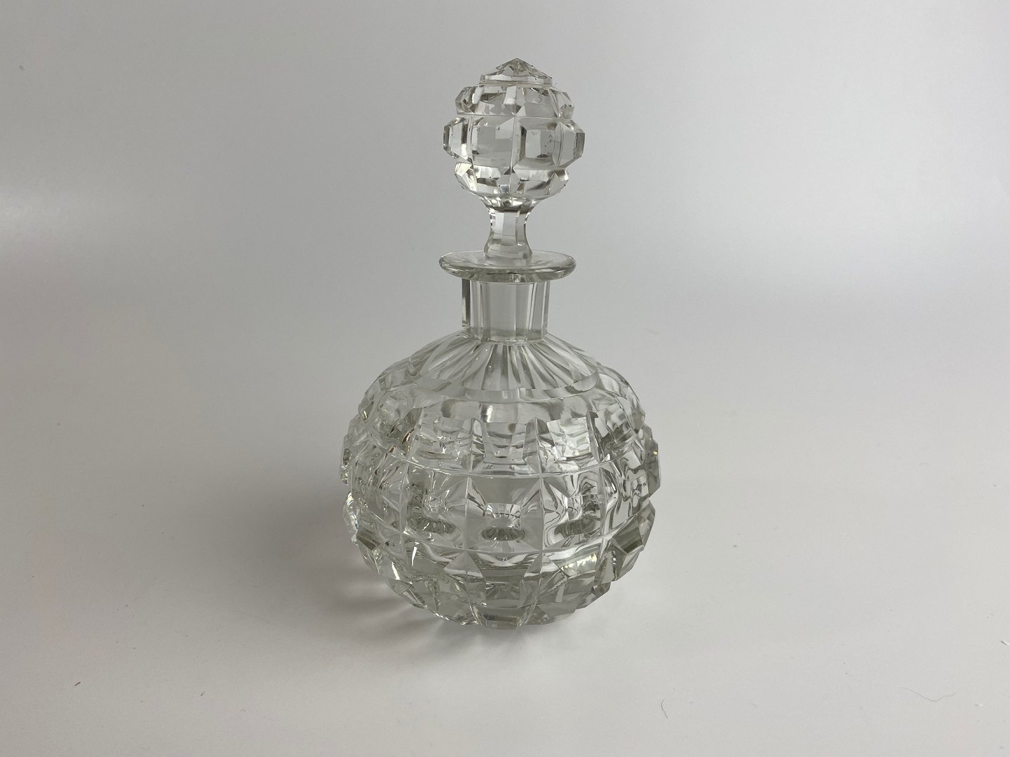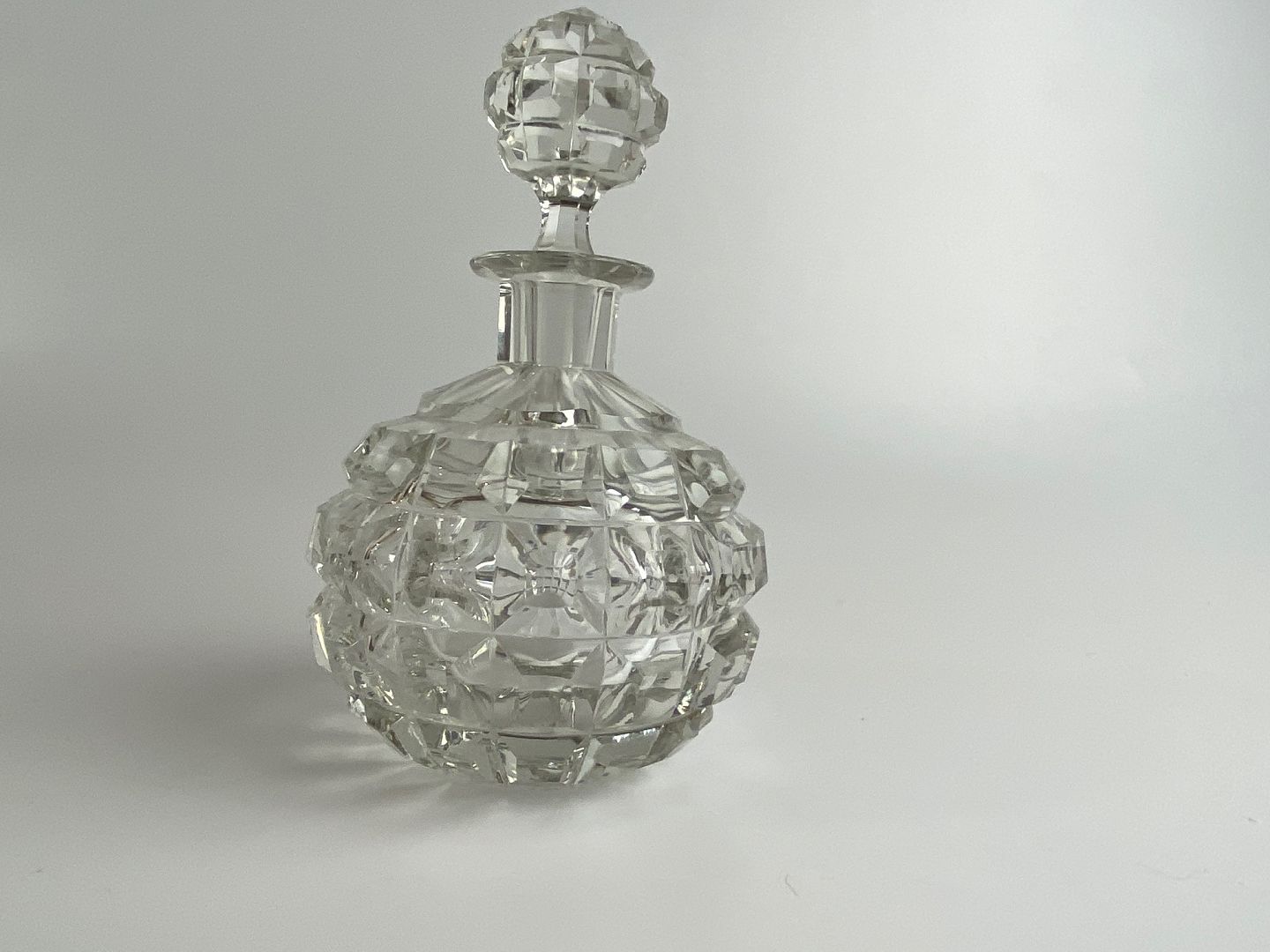 Parfumeflakon af krystal glas, Art Deco stil. Meget fin stand. Højde 11 centimeter til halsrand, fuld højde med prop: 16 centimeter.