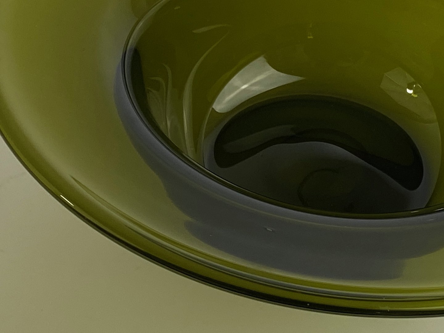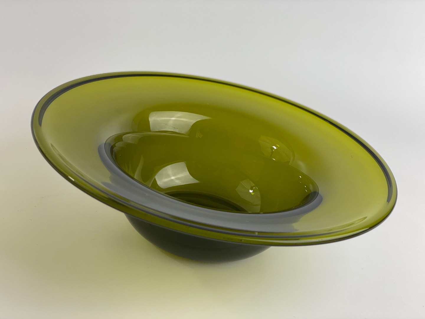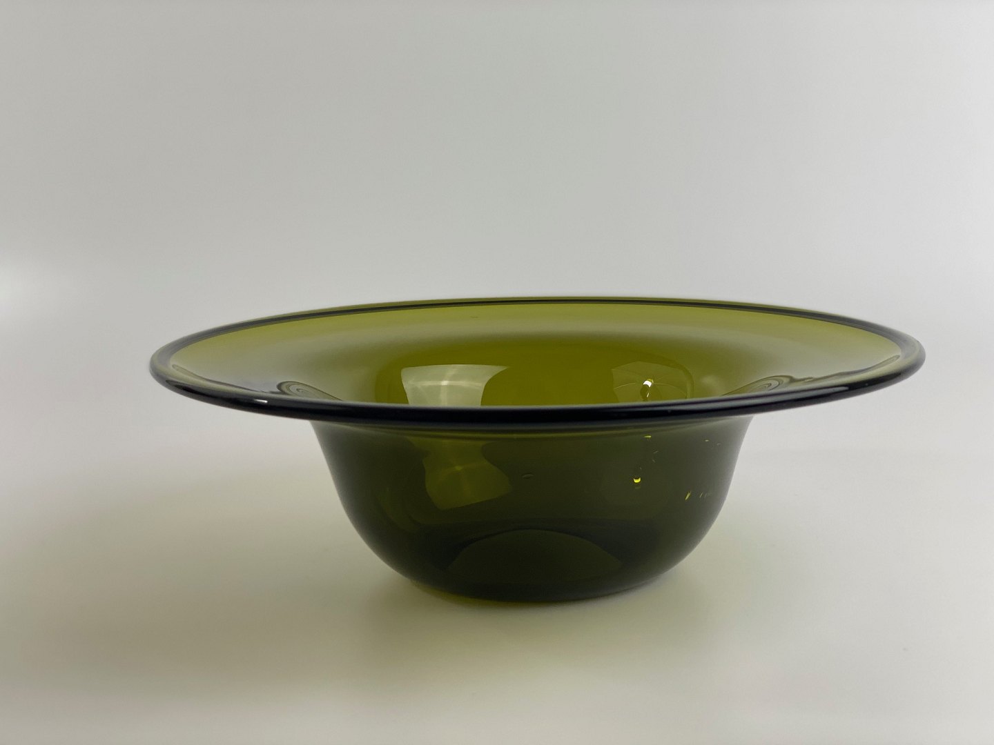 Gammel glasskål / glasfad af mosgrønt glas med form som en hat. Slitage.