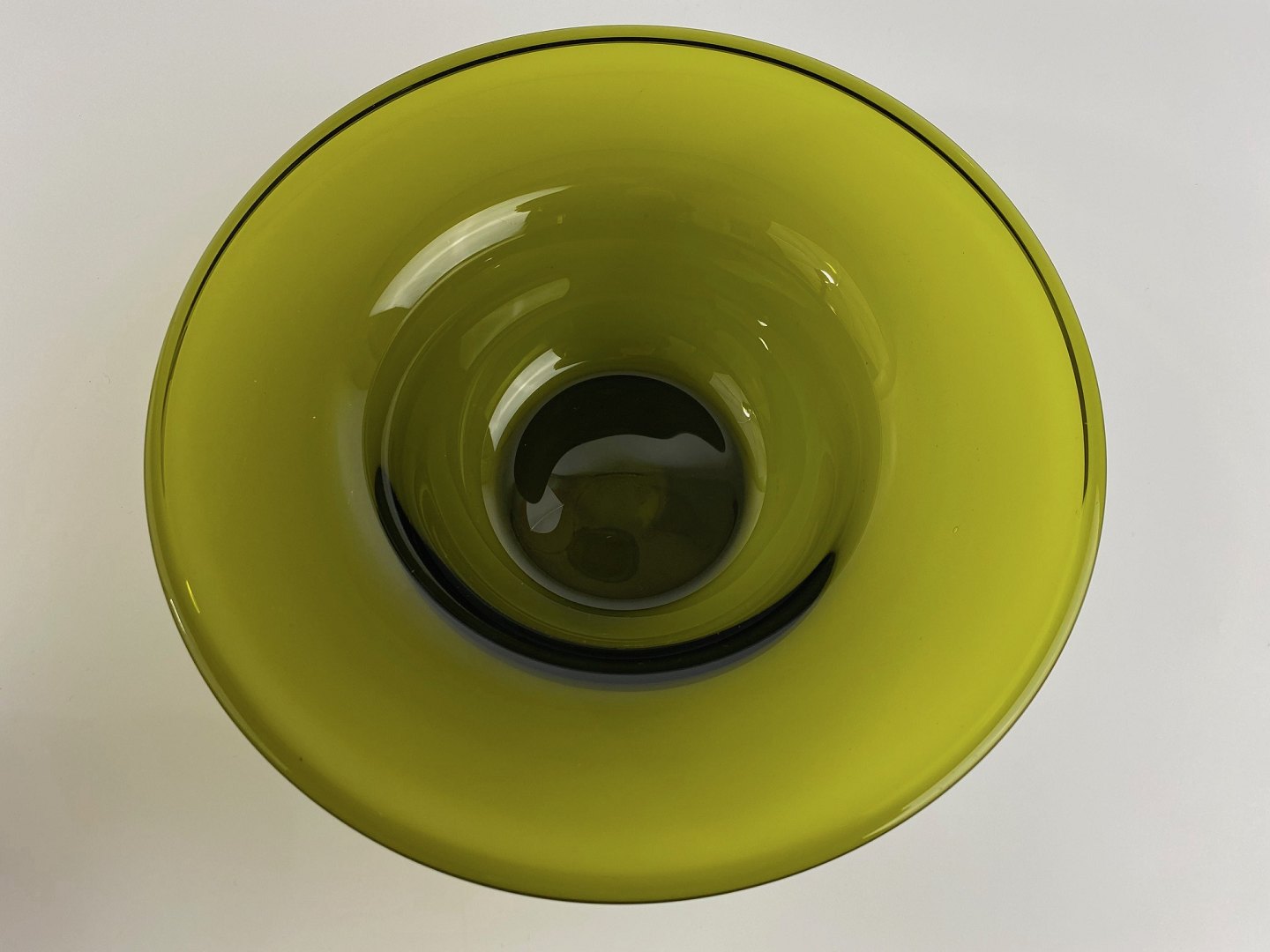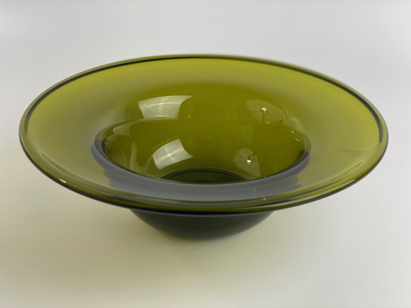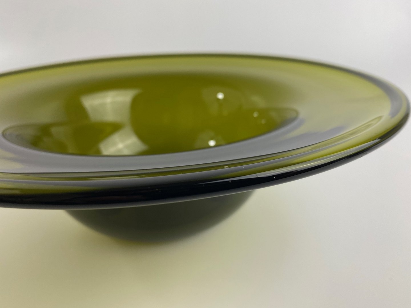 Gammel glasskål / glasfad af mosgrønt glas med form som en hat. Slitage.