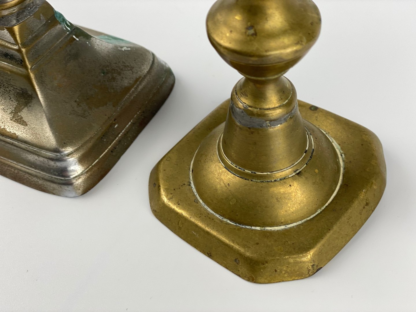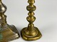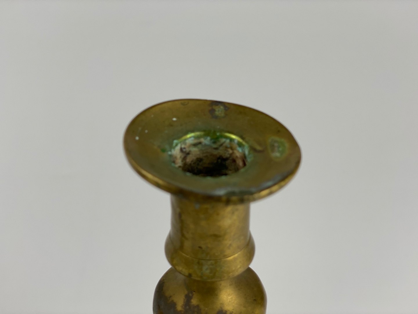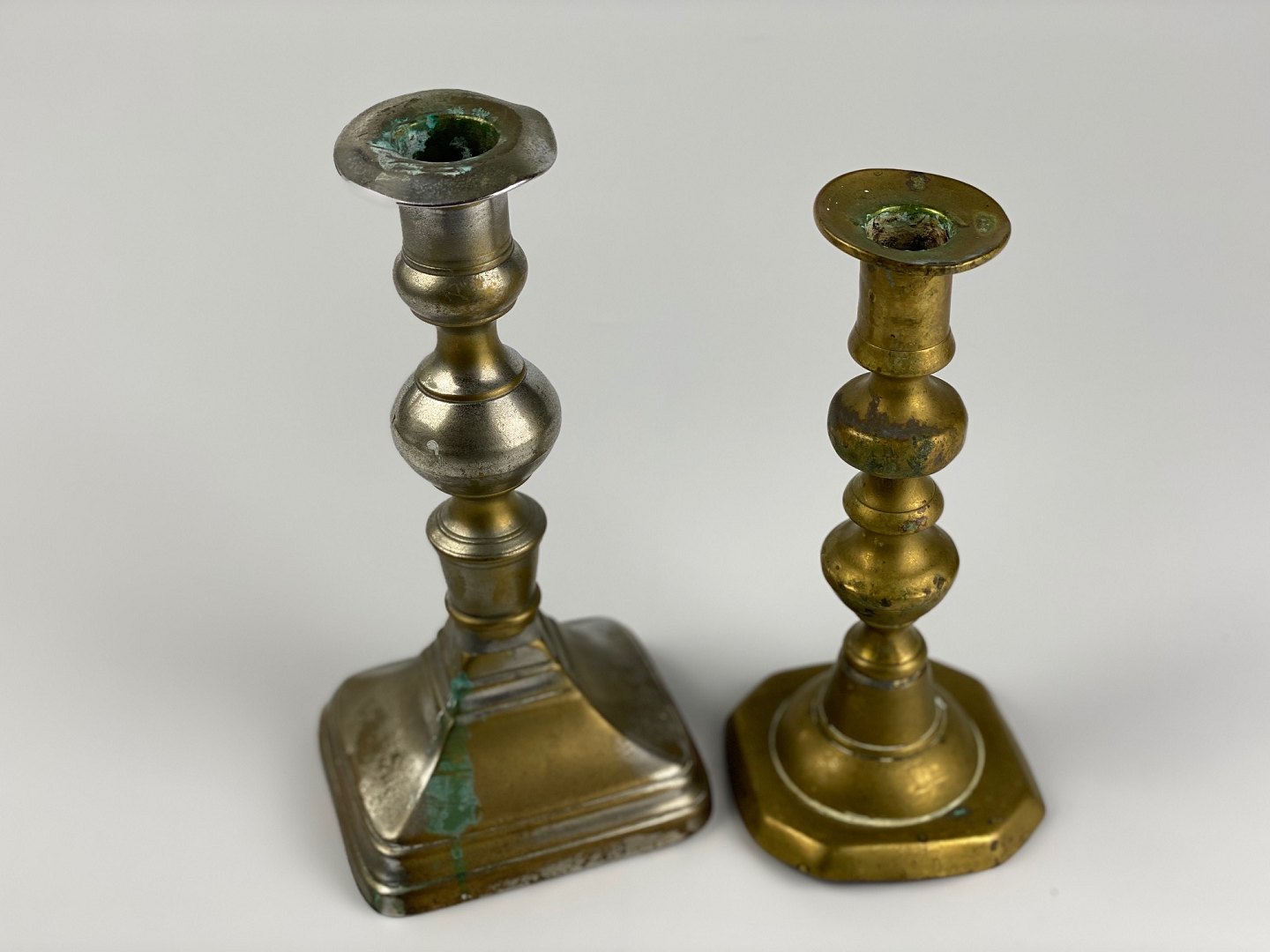 Pair of beautiful, antique English candlesticks with "push up" function / stick, which, however, no longer works. The candlesticks have lots of patina, including skews and repairs and appear with lots of charm.