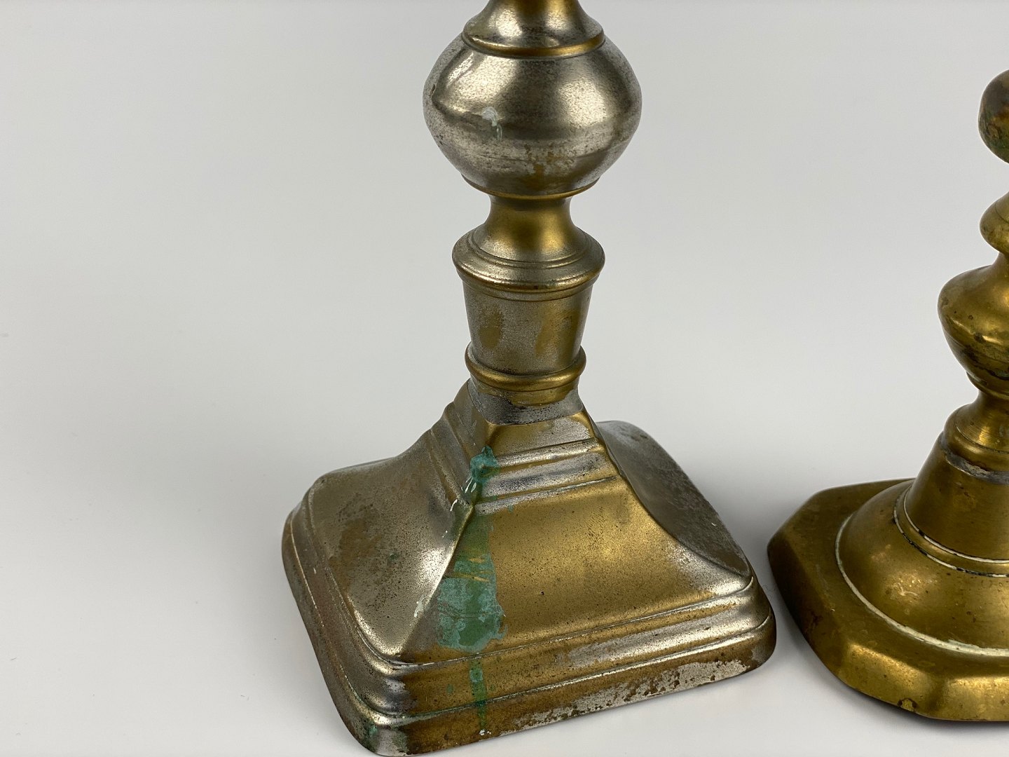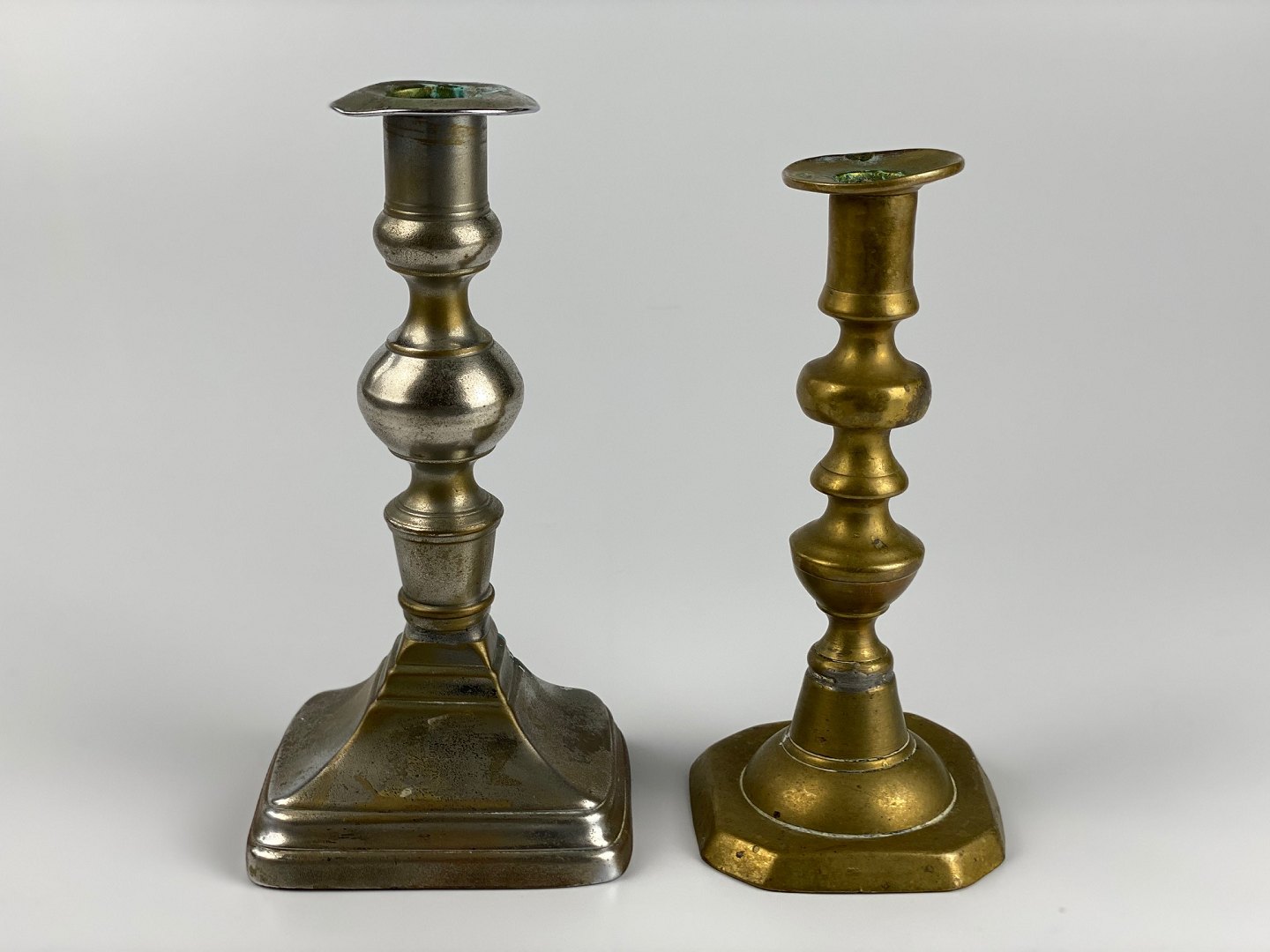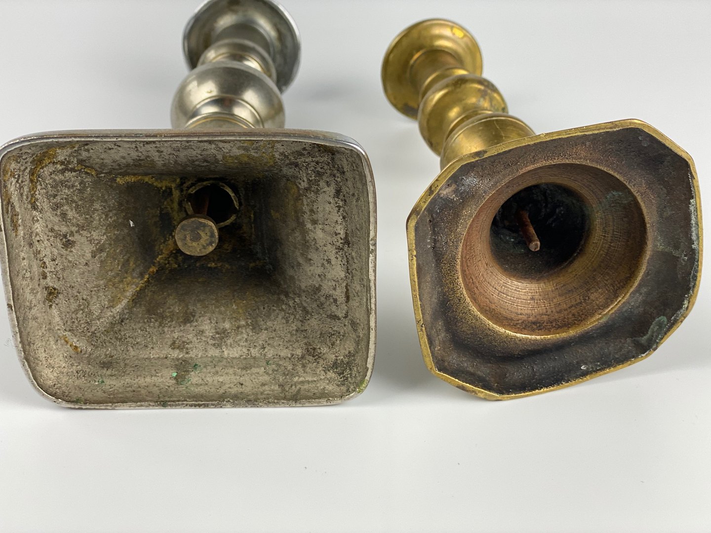 Pair of beautiful, antique English candlesticks with "push up" function / stick, which, however, no longer works. The candlesticks have lots of patina, including skews and repairs and appear with lots of charm.