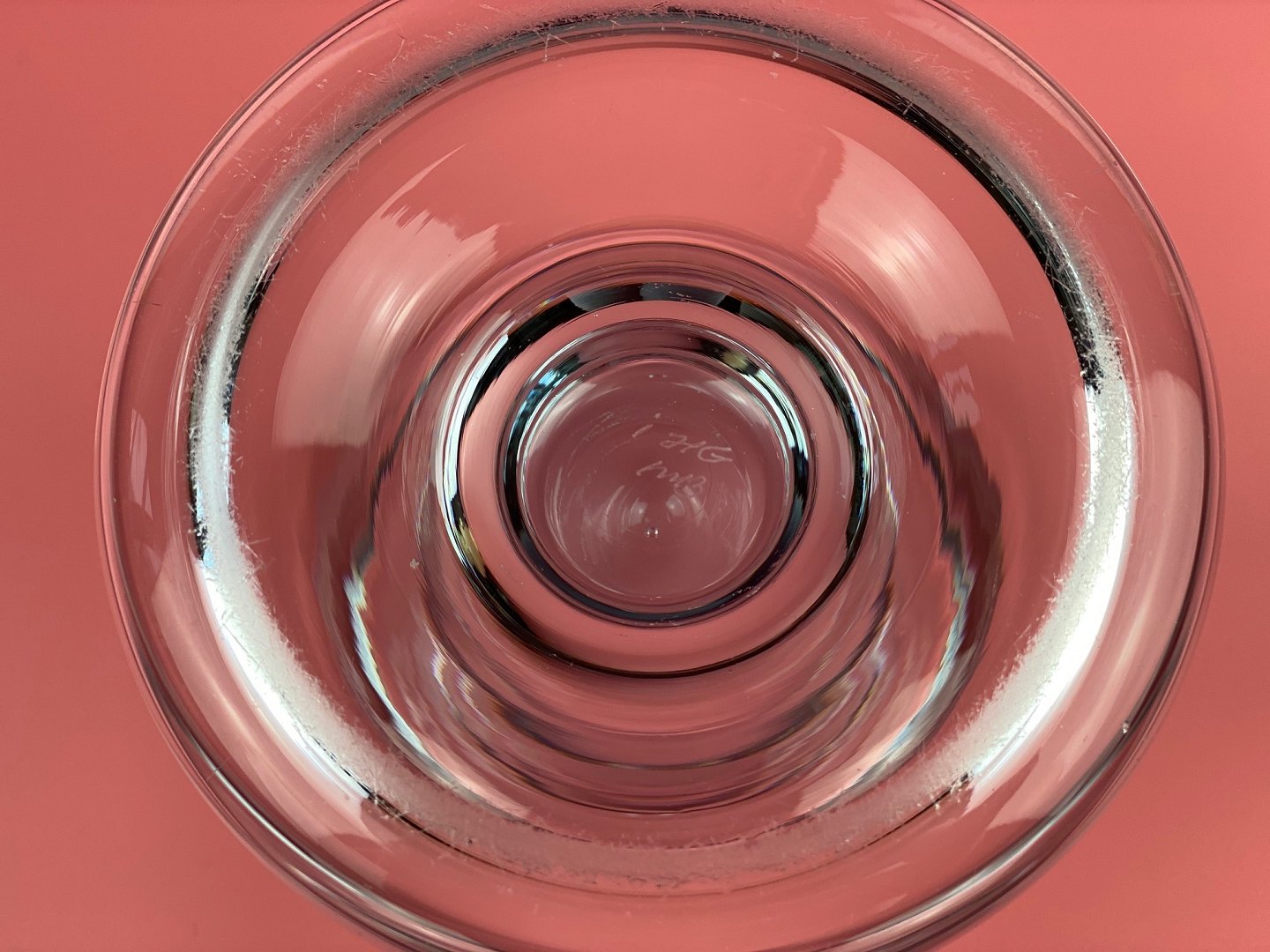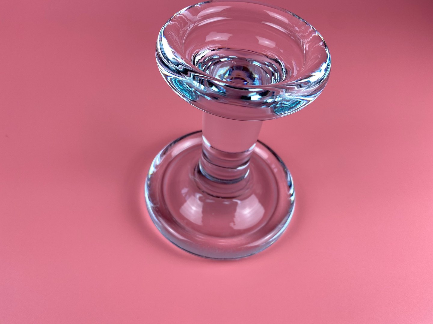 Lysestage af massivt, klart glas af Michael Bang for Holmegaard i 1978. Stagen hedder Adonis og måler 15,50 centimeter i højden og er 12,60 centimeter bred.