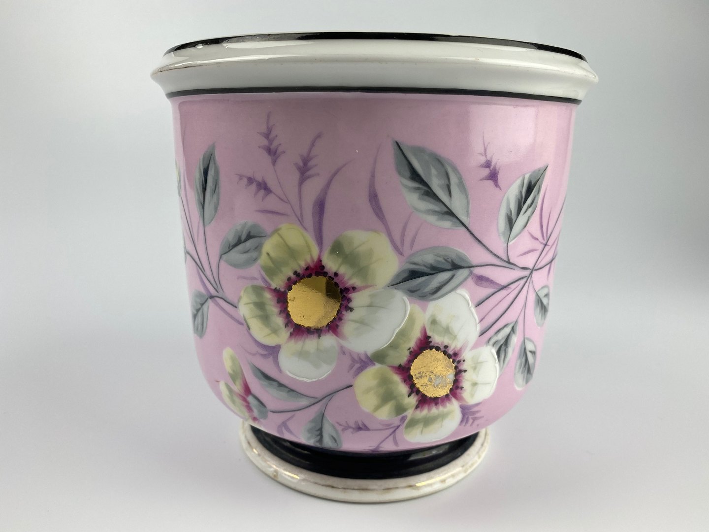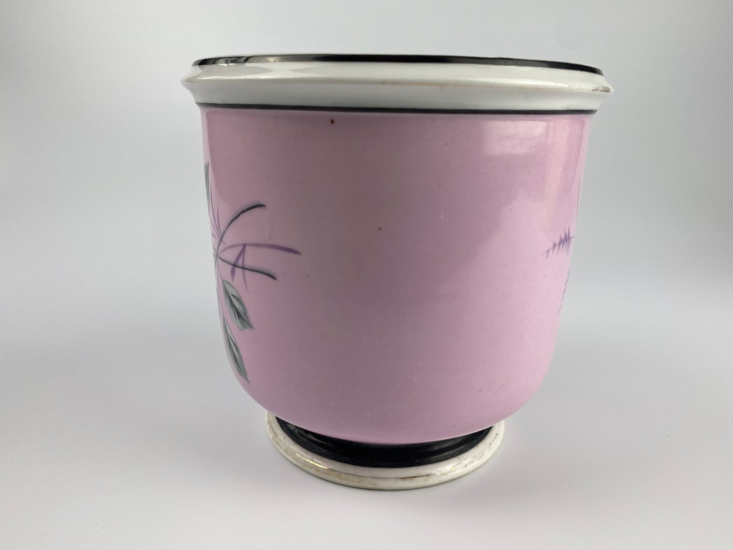 Smuk, fransk urtepotteskjuler / Napoleon den tredje cachepot med fint blomstermotiv på lyserød baggrund. 1800-tal.