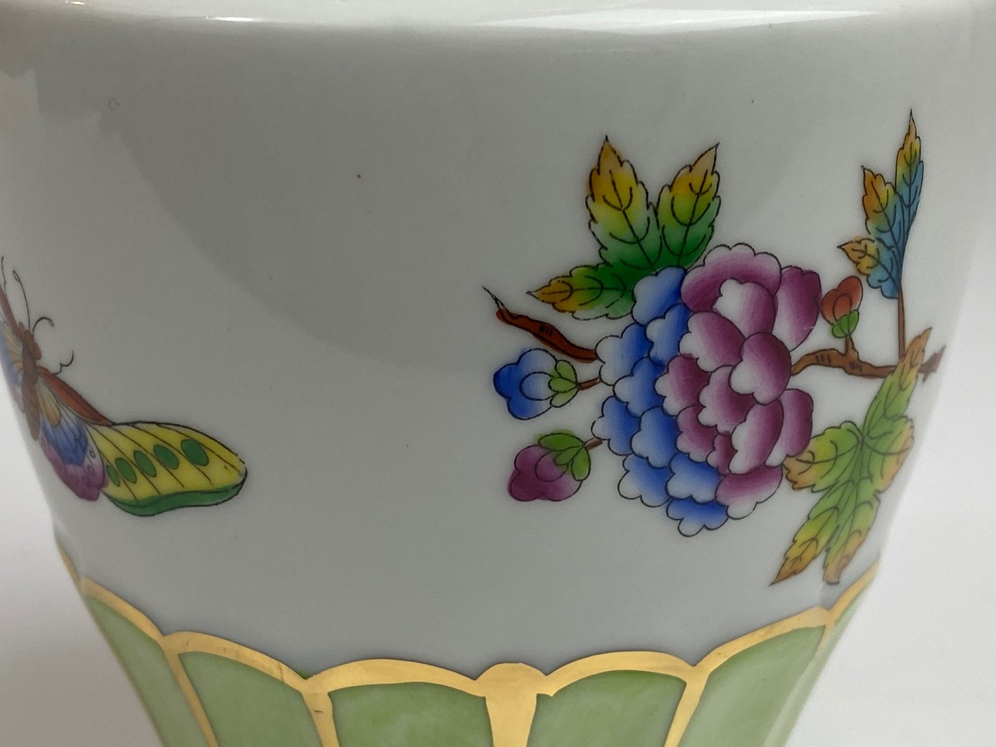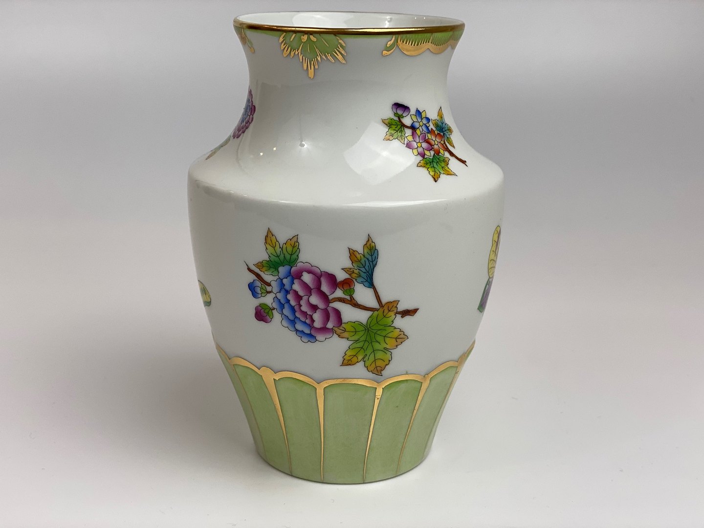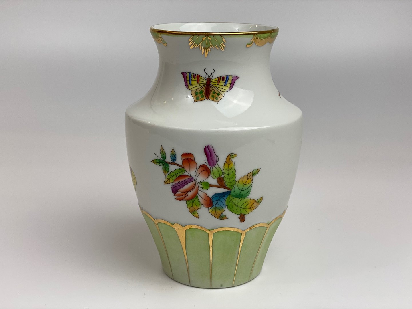 Vase from the Hungarian porcelain factory Herend with the 125th anniversary mark from 1964. Queen Victoria pattern in green and gold with multicolored flowers and butterflies.
