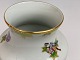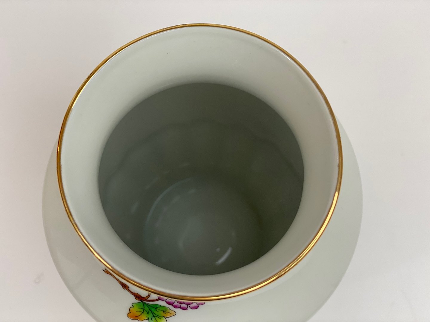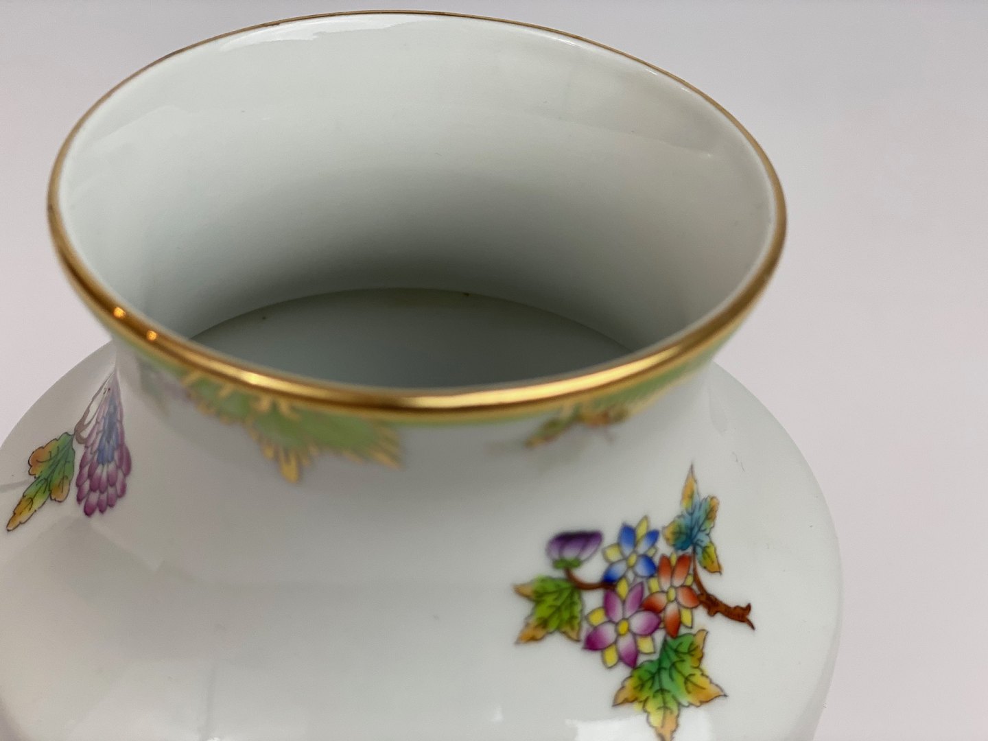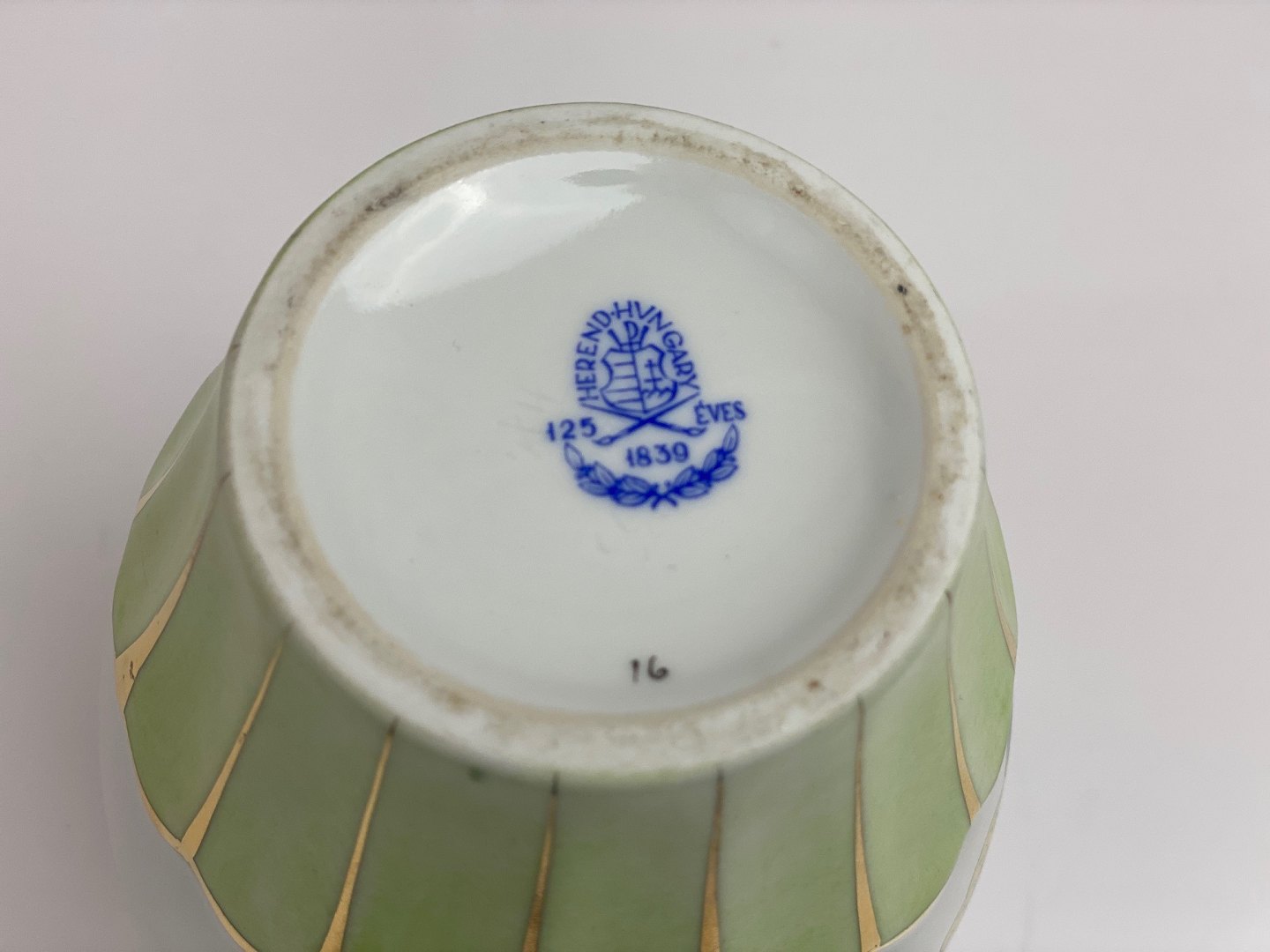 Vase from the Hungarian porcelain factory Herend with the 125th anniversary mark from 1964. Queen Victoria pattern in green and gold with multicolored flowers and butterflies.