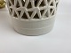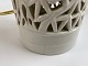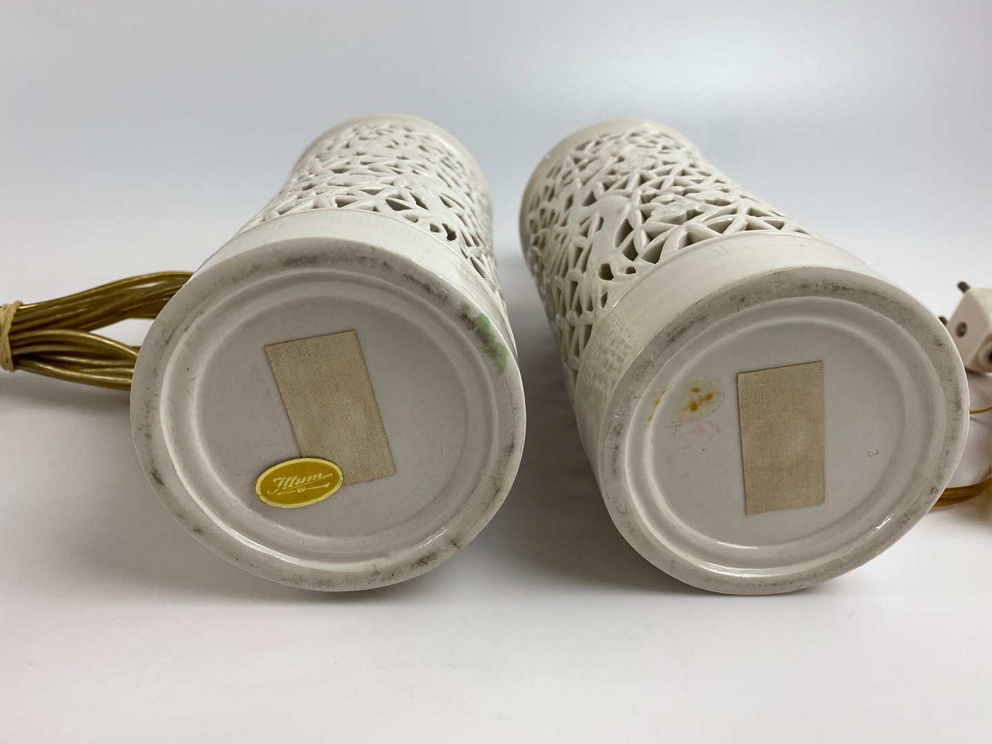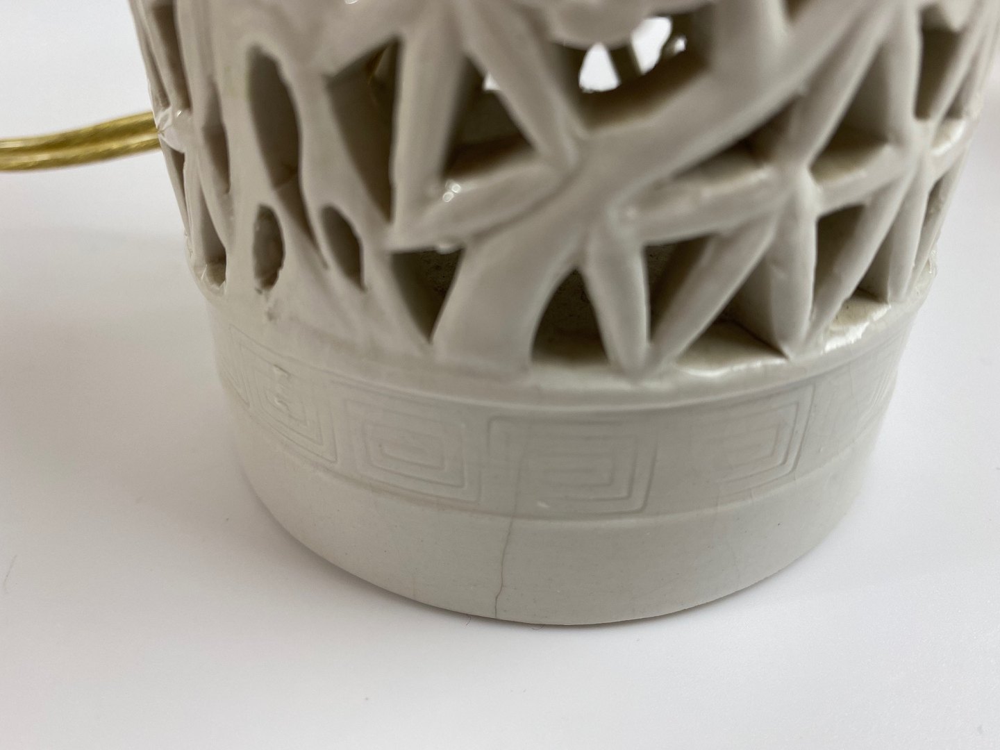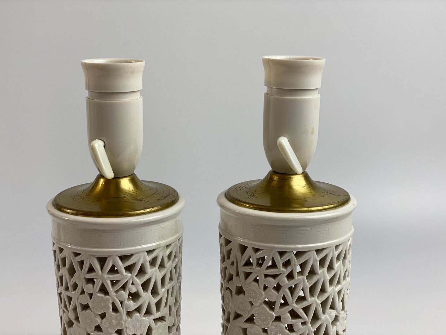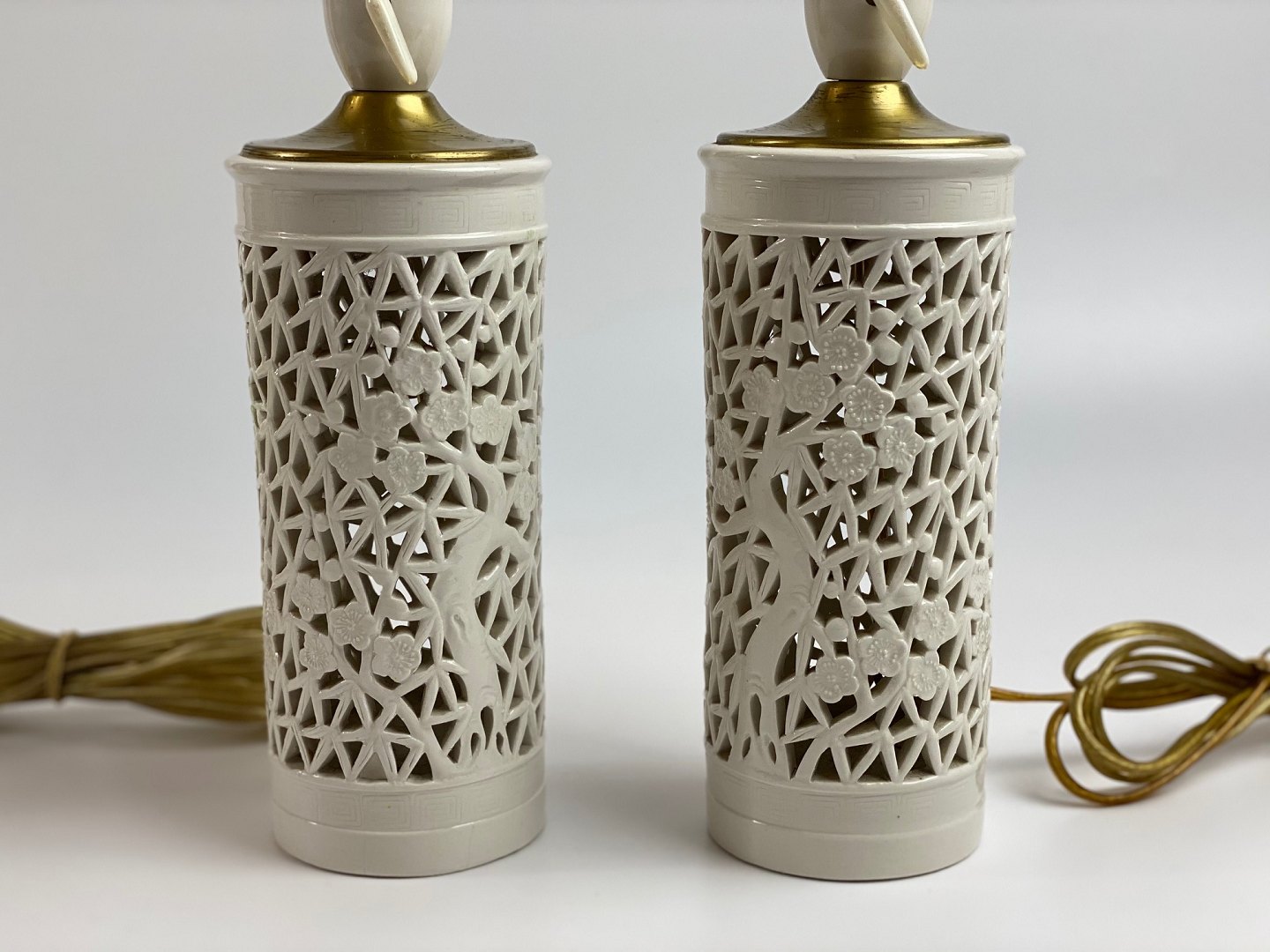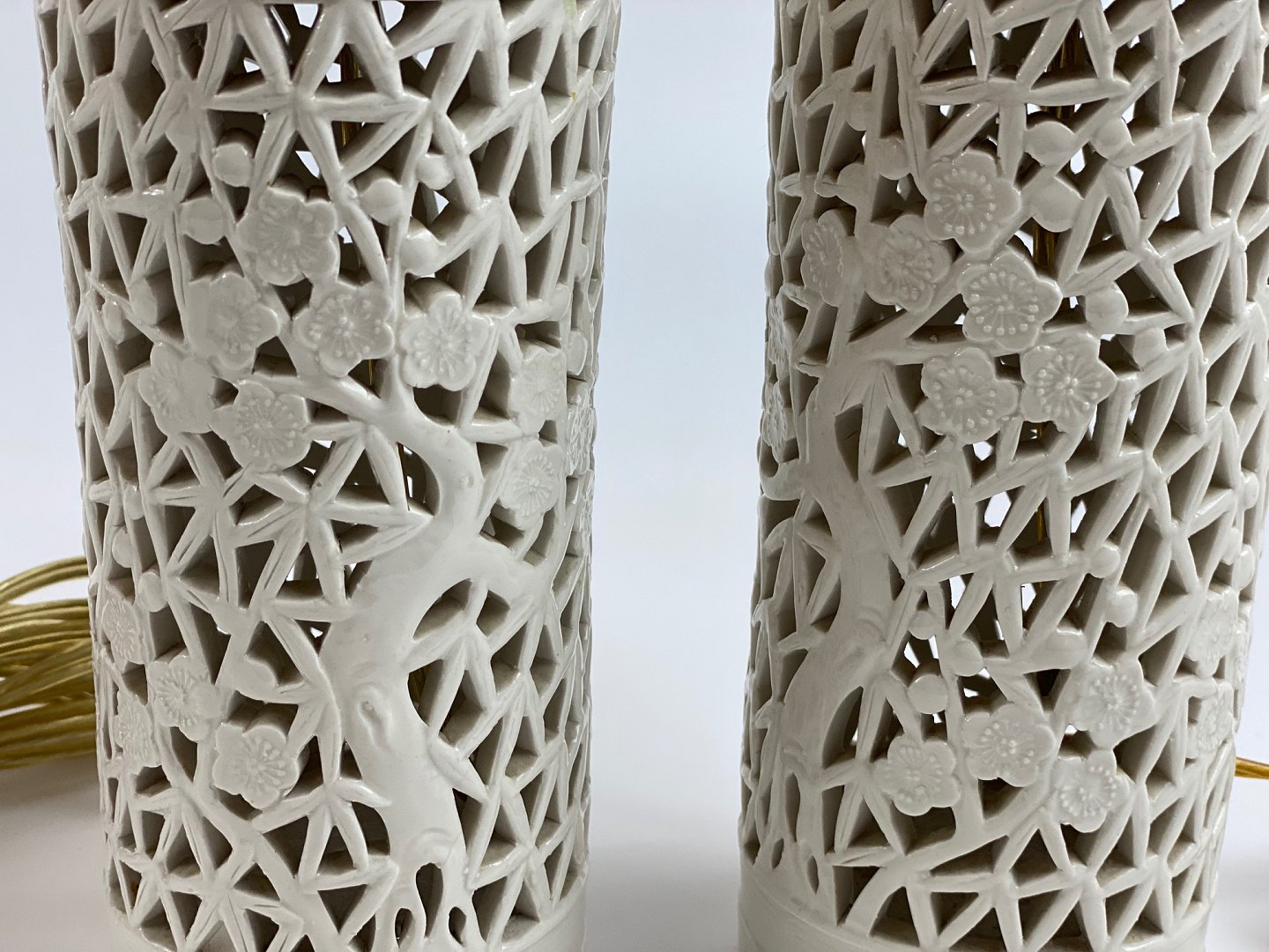 Et par smukke kinesiske / asiatiske blanc de chine søjleformede bordlamper med papirsklip-lignende gitter-mønster med blomstrende kirsebærgrene. Geometrisk mønstret bånd øverst og nederst.