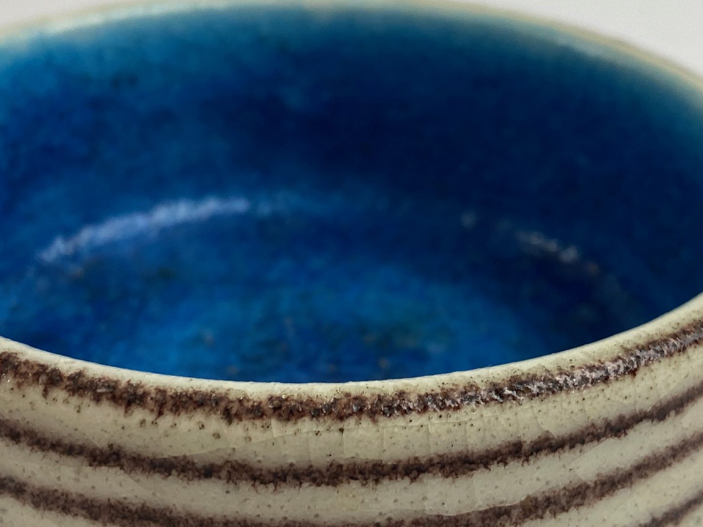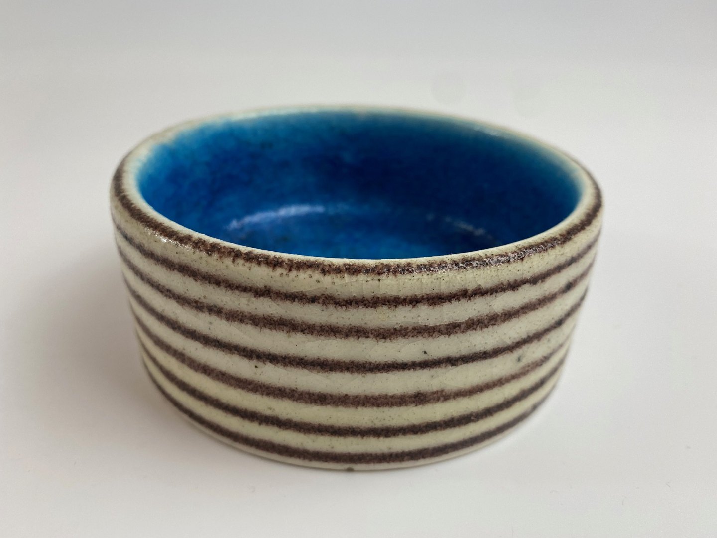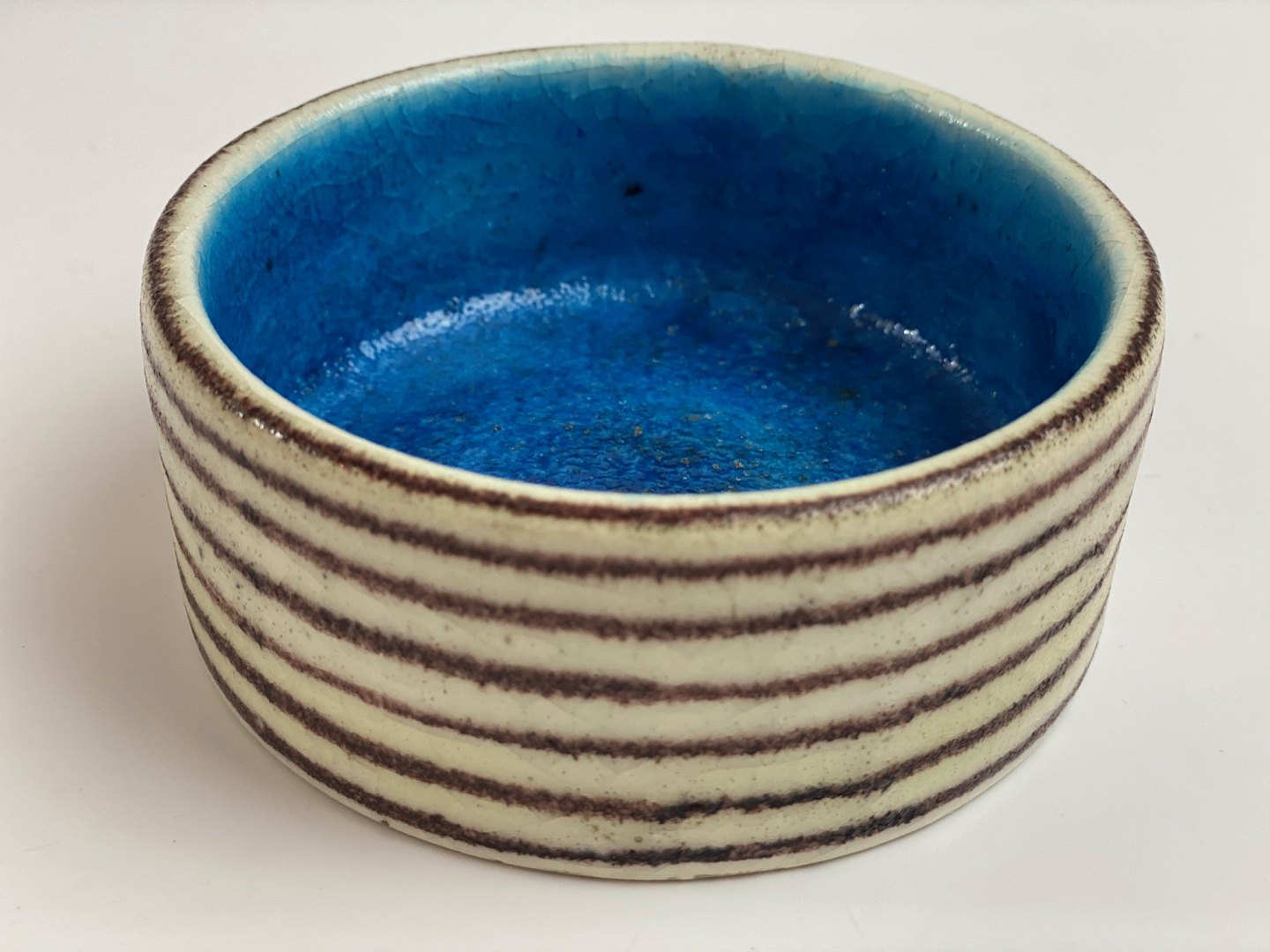 Beautiful, small ceramic bowl by the famous Italian ceramicist Guido Gambone. The bowl is marked with Gambone's characteristic donkey mark. Beautiful sky blue color inside with beige and brown stripes on the outside. There are crackles in the glaze and the bowl has a minimal drop at the base as well glaze scraper in the edge under the bottom.