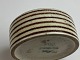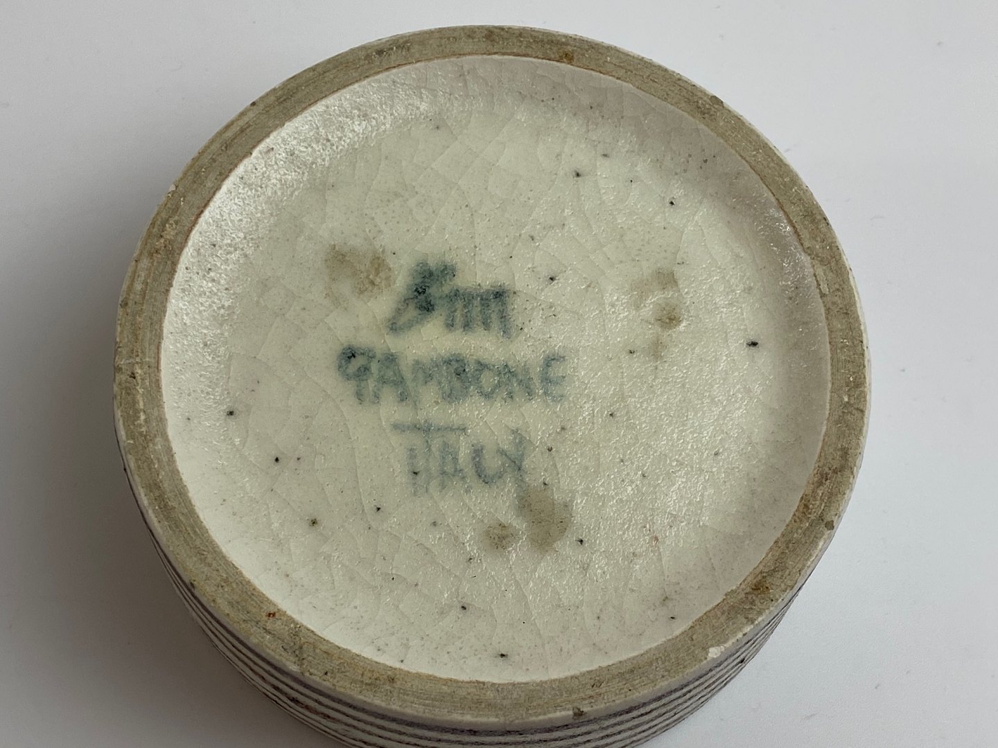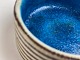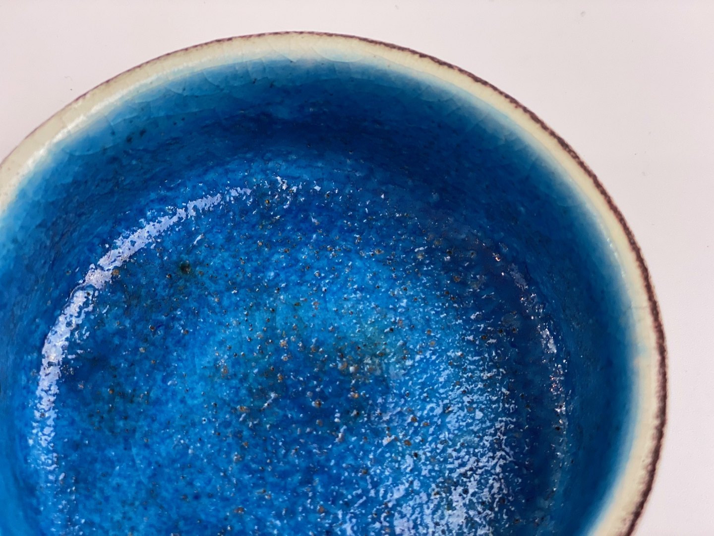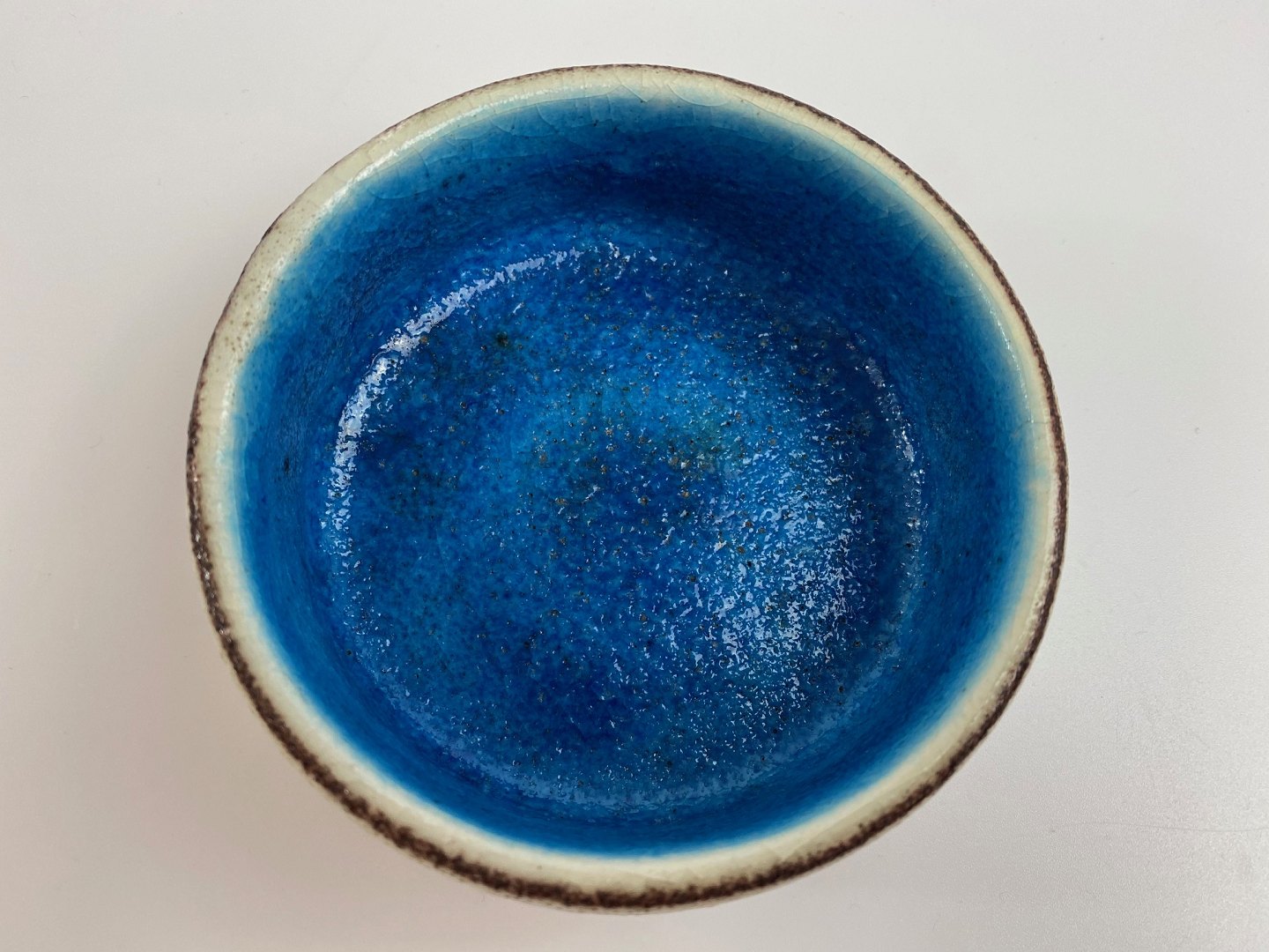 Beautiful, small ceramic bowl by the famous Italian ceramicist Guido Gambone. The bowl is marked with Gambone's characteristic donkey mark. Beautiful sky blue color inside with beige and brown stripes on the outside. There are crackles in the glaze and the bowl has a minimal drop at the base as well glaze scraper in the edge under the bottom.