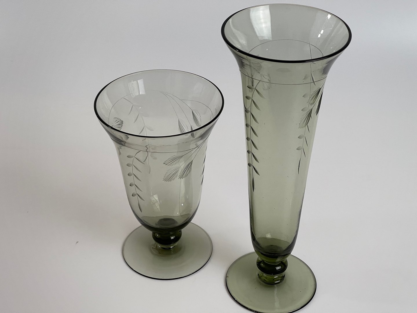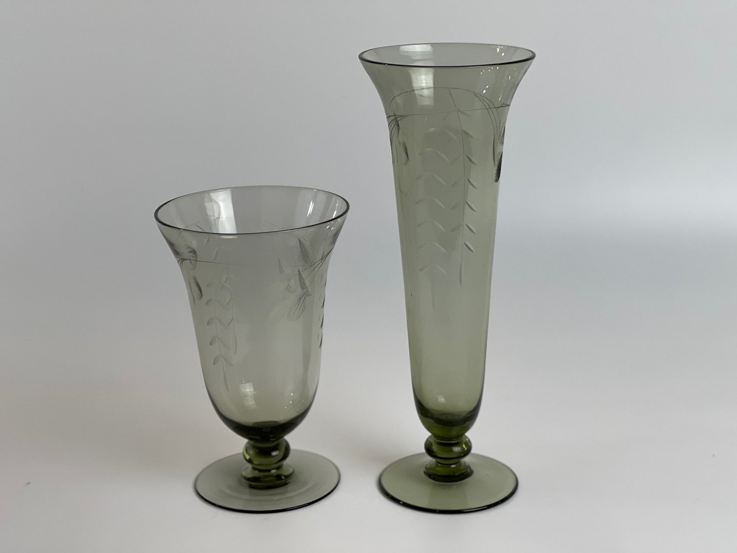 Par art deco glasvaser med slebet dekoration af bladranker i farven røgtopas med grønt skær. Vaserne er i Swedish Grace-stilen, men stammer formentlig fra danske Holmegaard.