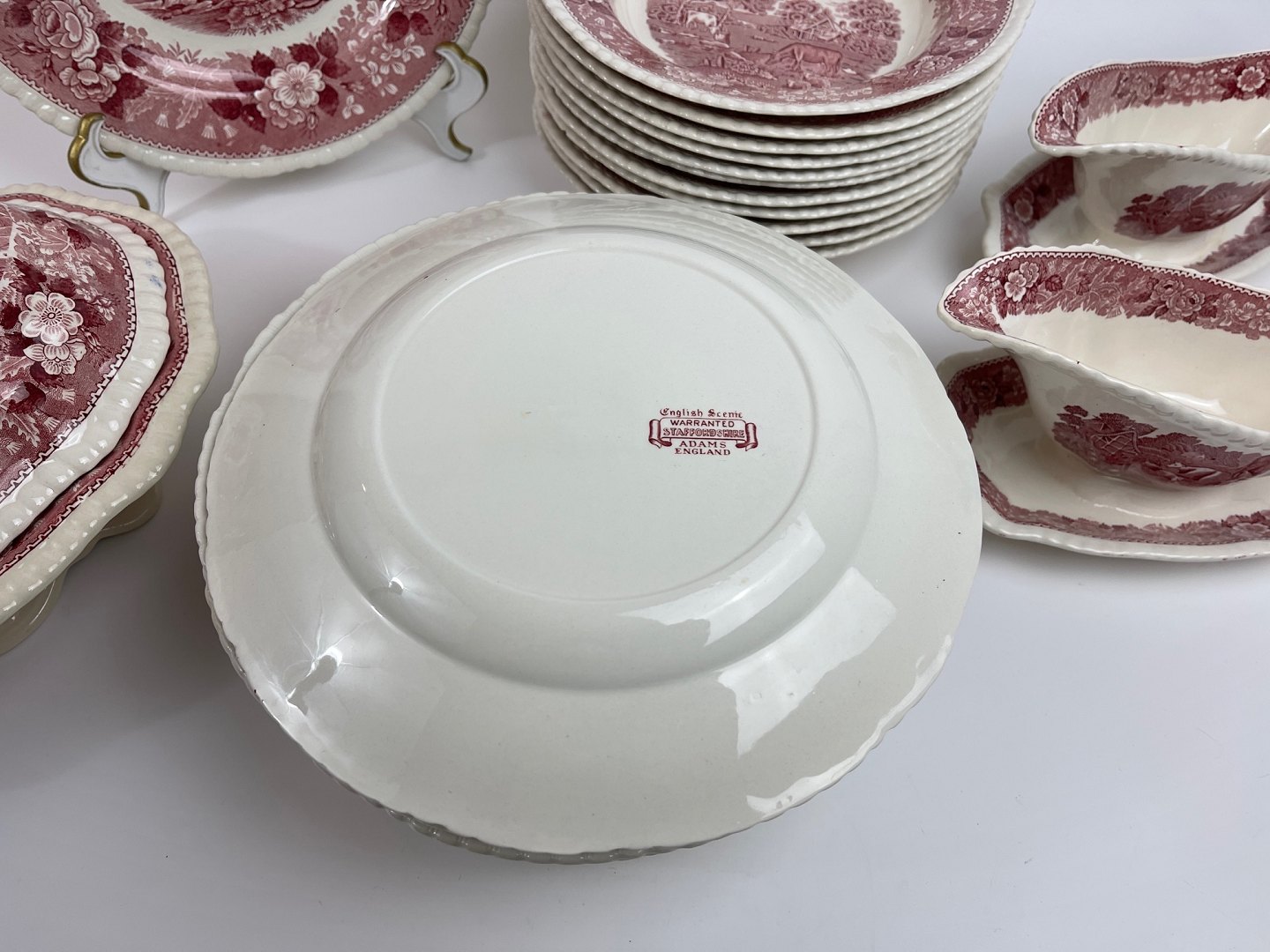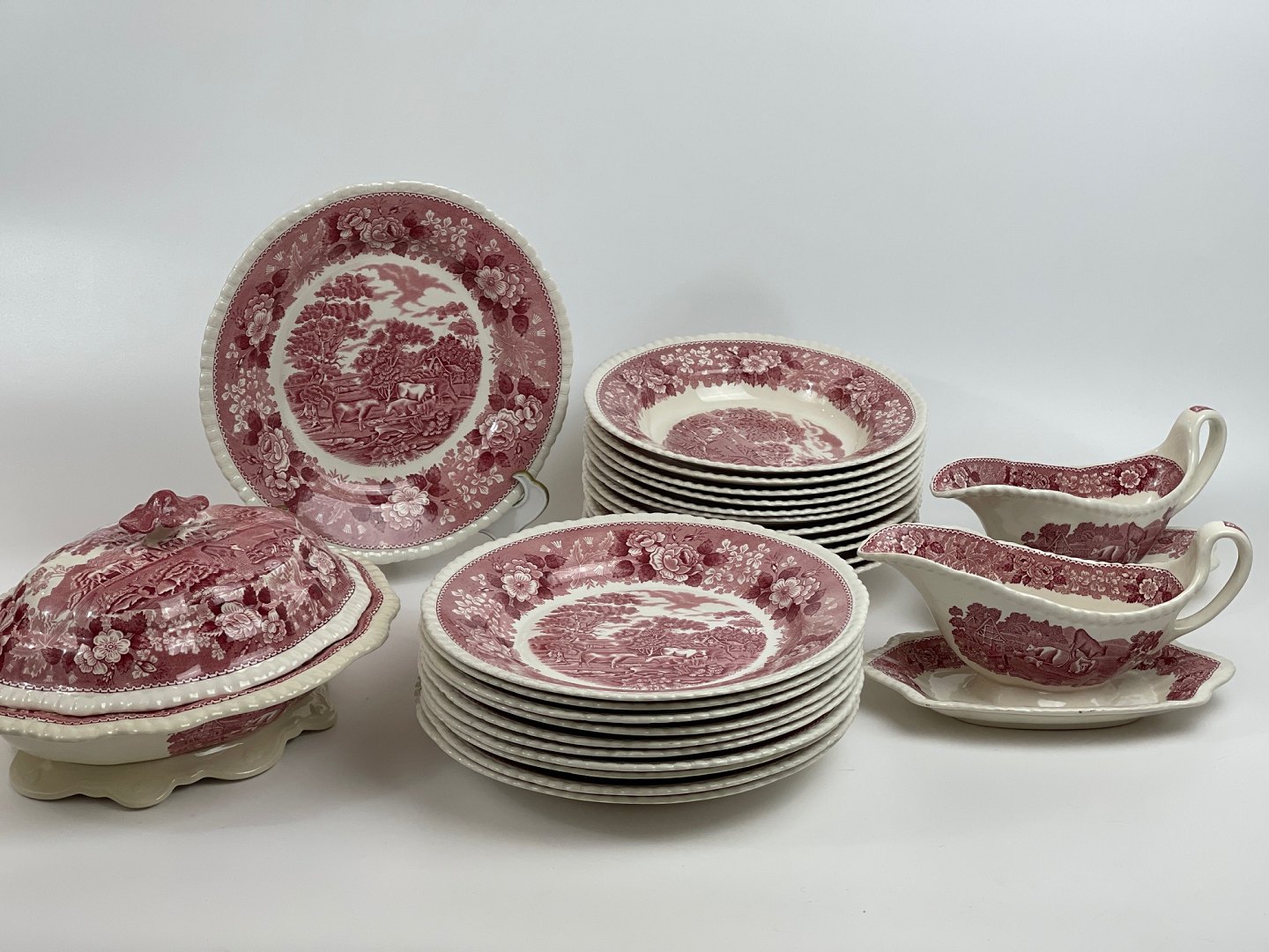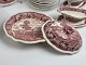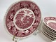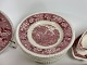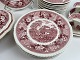 Engelsk fajance middagsservice fra Adams, English Scenic, Staffordshire i rød/pink. Vi har suppetallerkener/ymerskåle, sovsebåde samt grønsags-terrin.