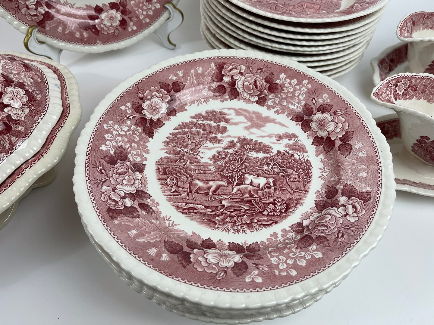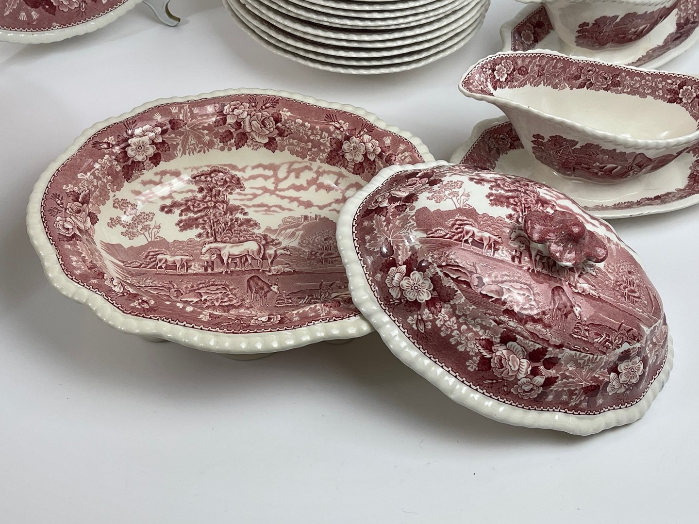 SE PRISEN I VAREBESKRIVELSEN - engelsk fajance suppetallerkener /ymerskåle, sovsebåd, grøntsagsterrin fra Adams English Scenic, Staffordshire, England, pink - rød paris, cattle scenes, horse scenes