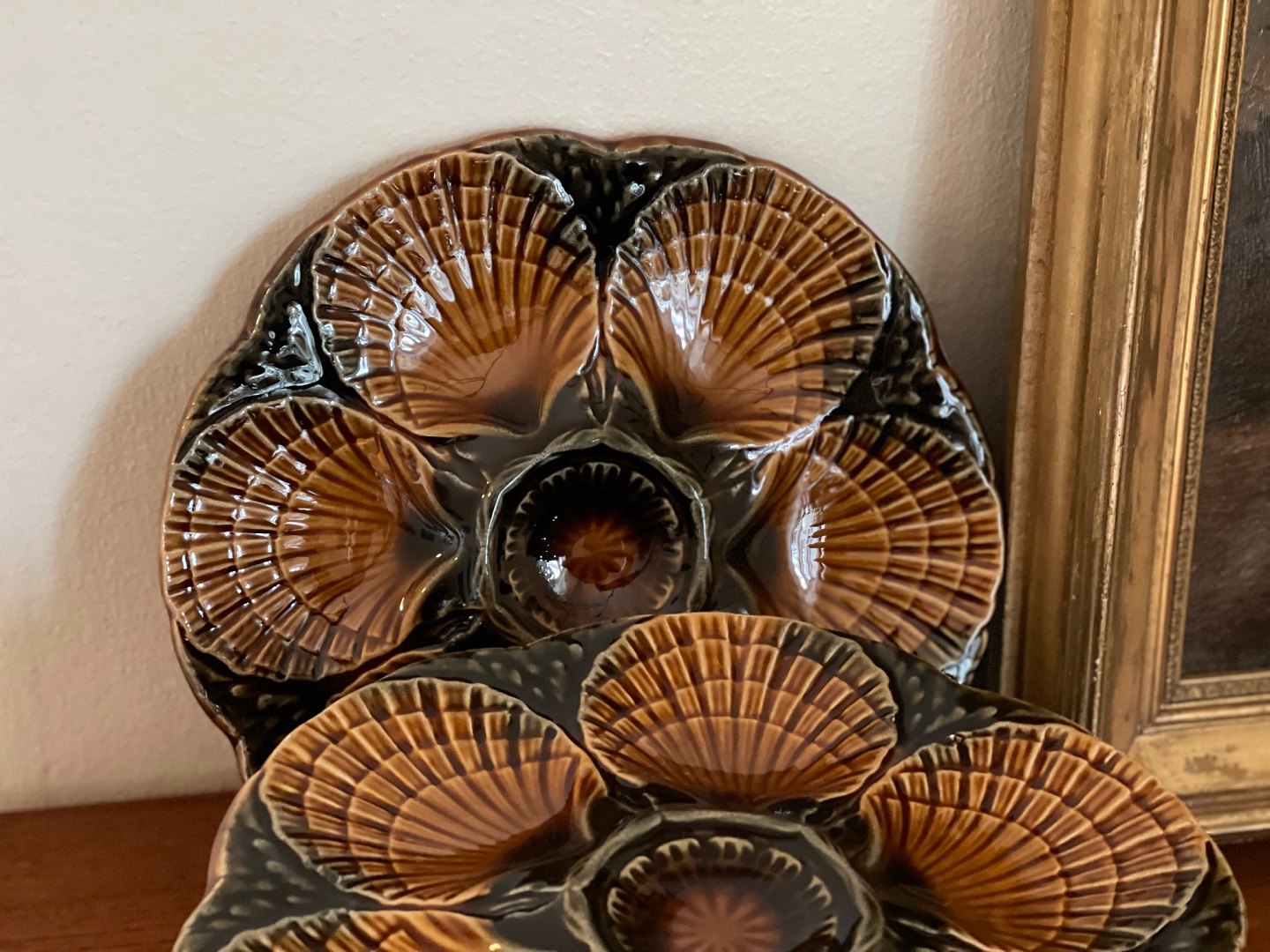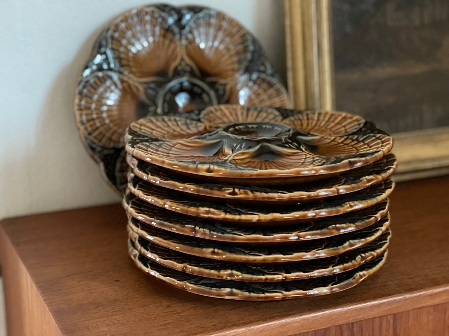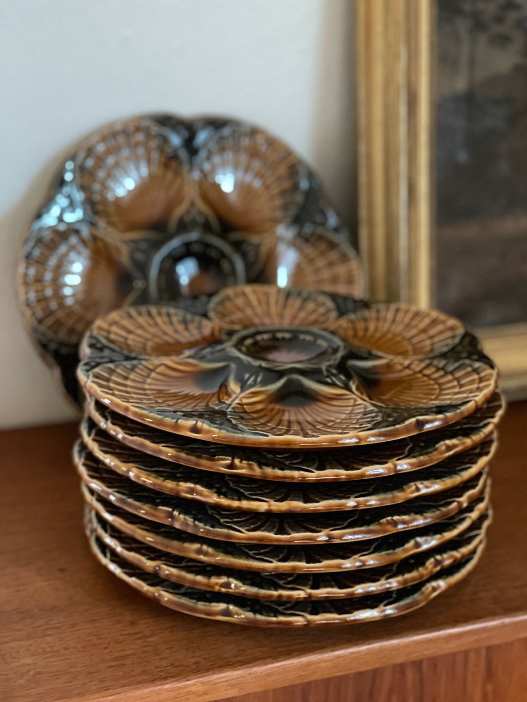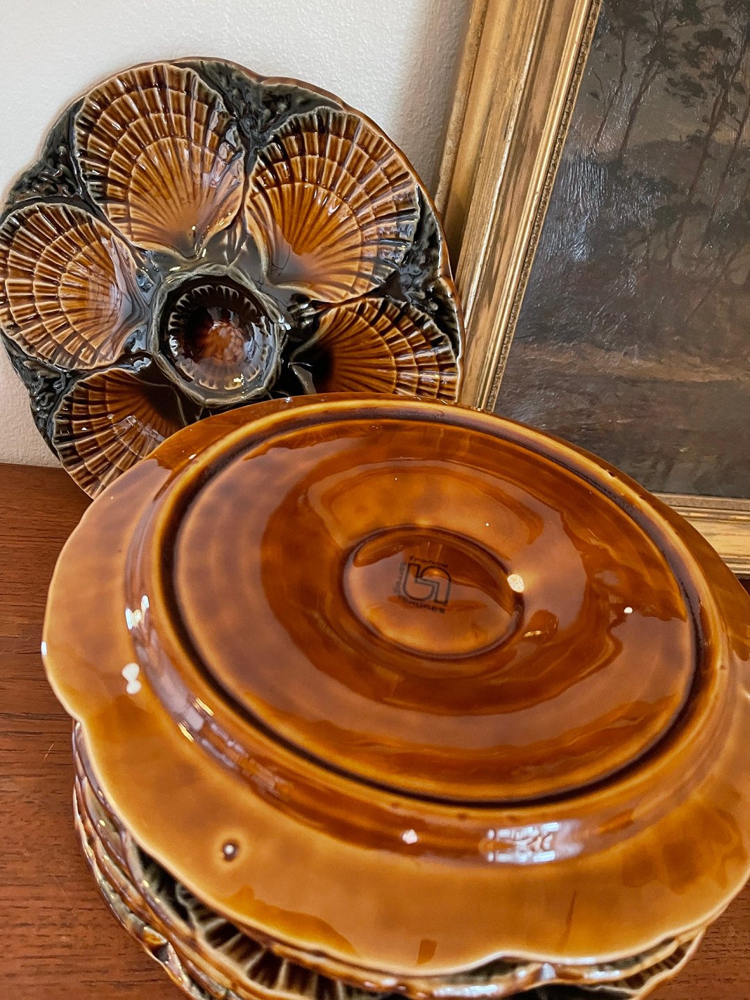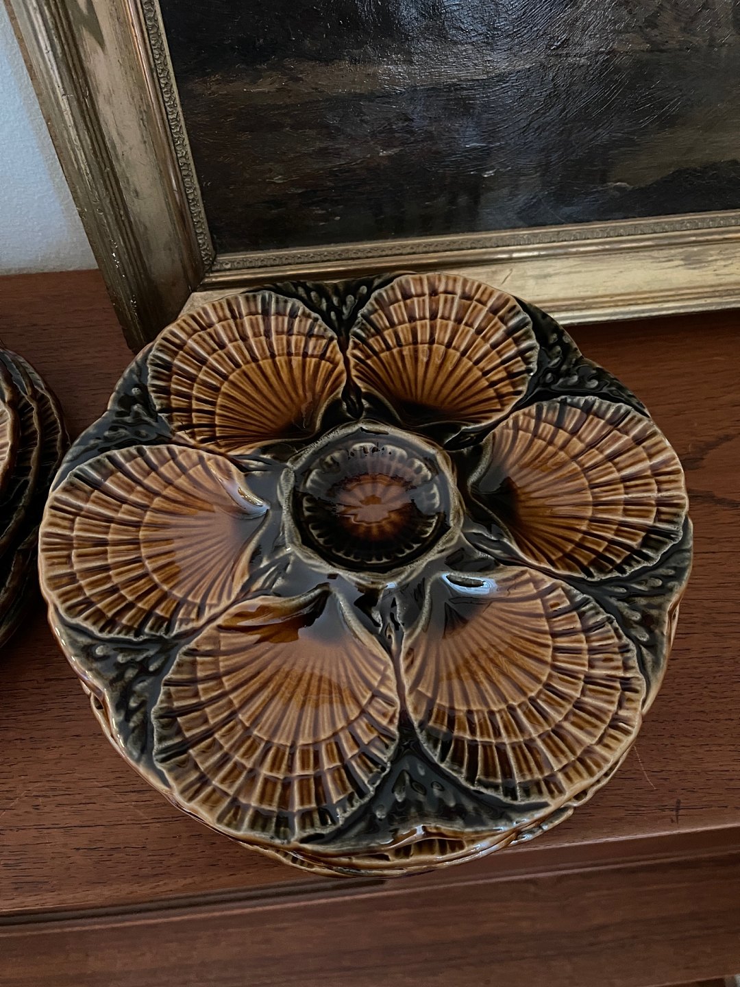 Franske tallerkener til østers eller tappas / fisketappas fra Sarreguemines. Tofarvede: Brune / koksgrå. 350 DKK per styk.