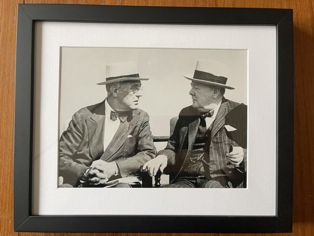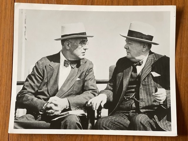 Originalt sort-hvidt vintage foto taget under Anden Verdenskrig af Winston Churchill og Franklin D. Roosevelt under den første tophemmelige Quebec konference i 1943 med kodenavnet Quadrant, som bl.a handlede om operation Overlord. Gelatine silver