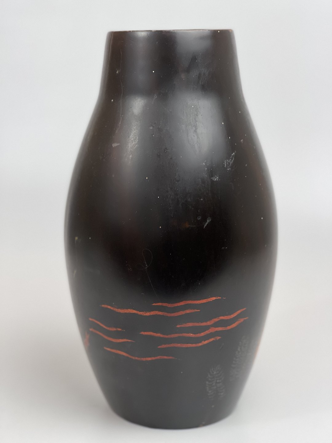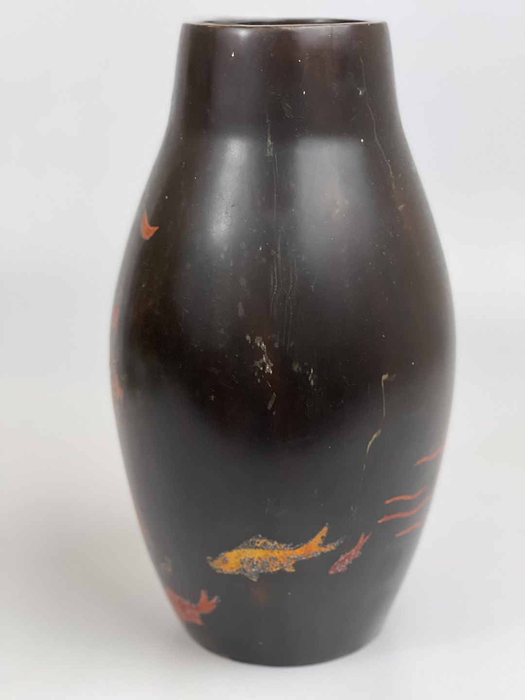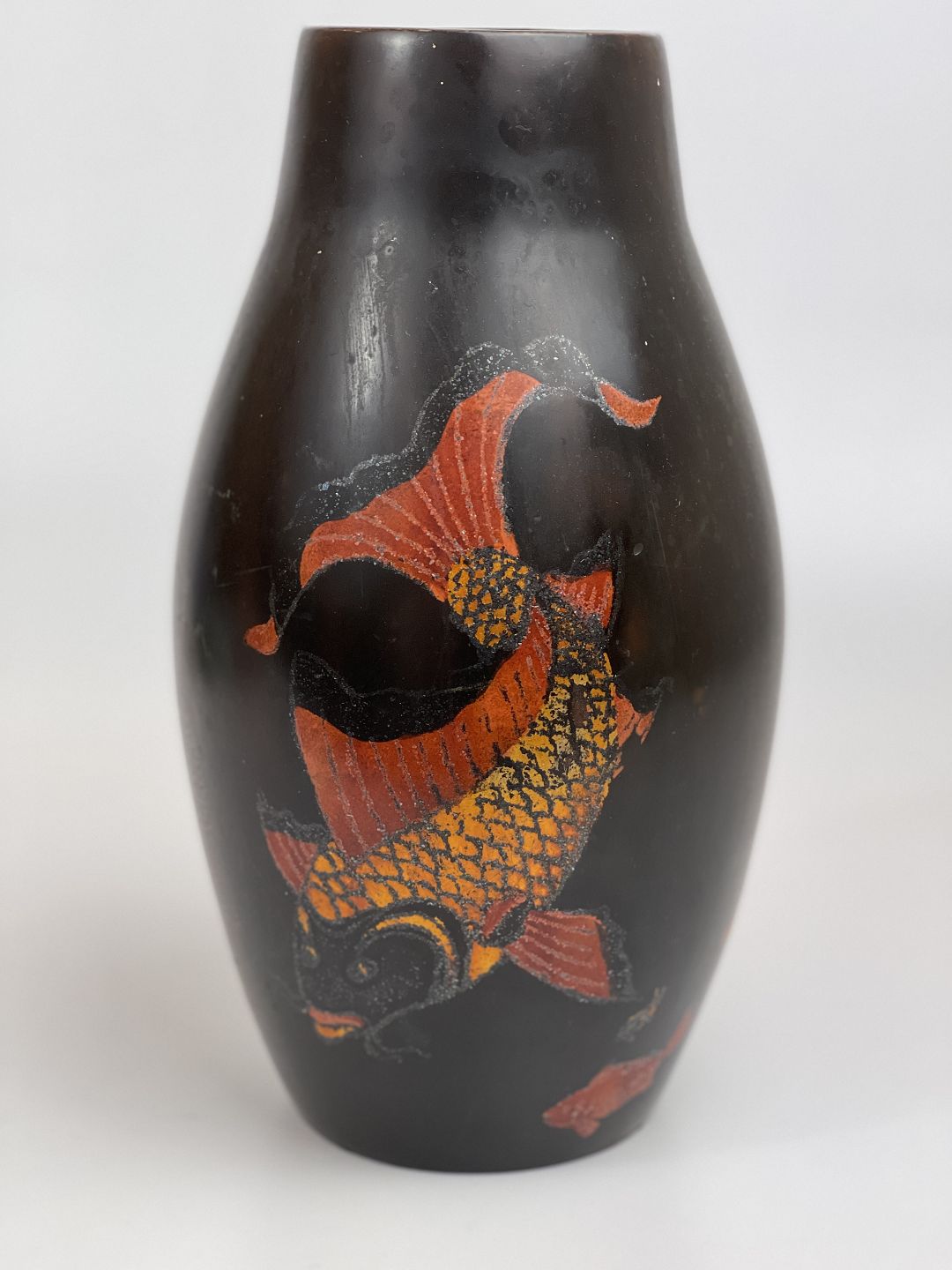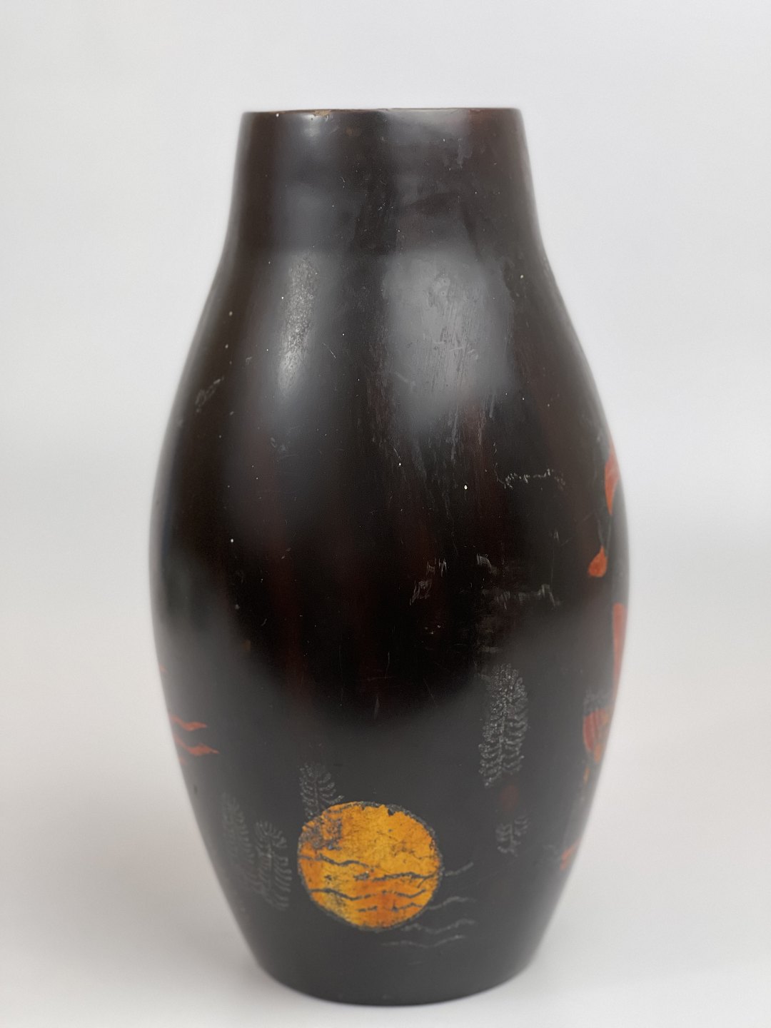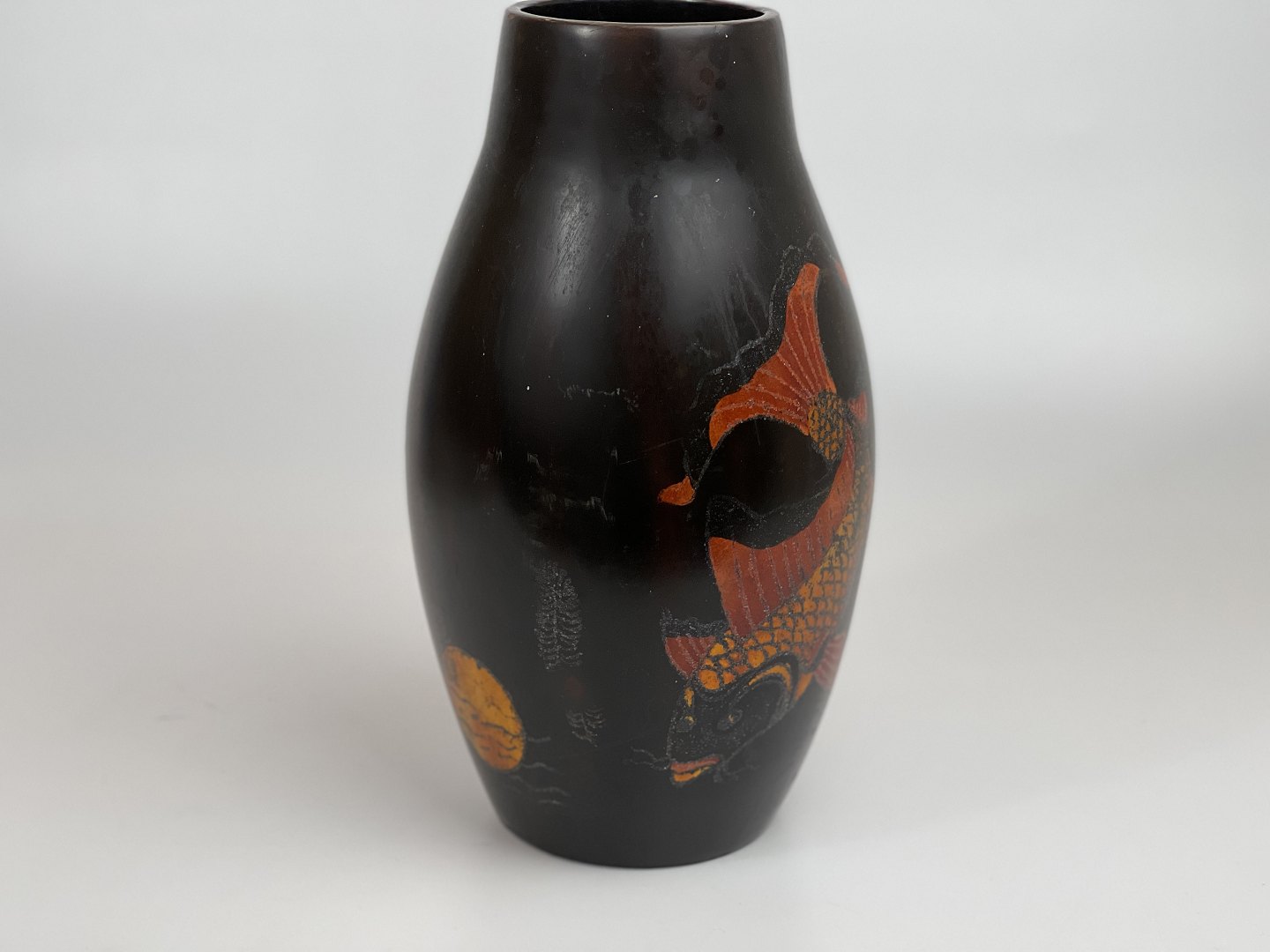 Vintage asiatisk lakvase med motiv af koifisk eller guldfisk samt solopgang eller solnedgang over havet. Japansk eller måske vietnamesisk.